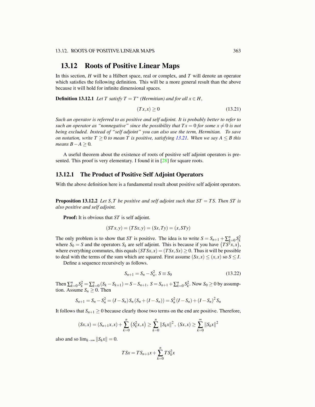 13.12.1 The Product of Positive Self Adjoint OperatorsWith the above definition here is a fundamental result about positive self adjoint operators.