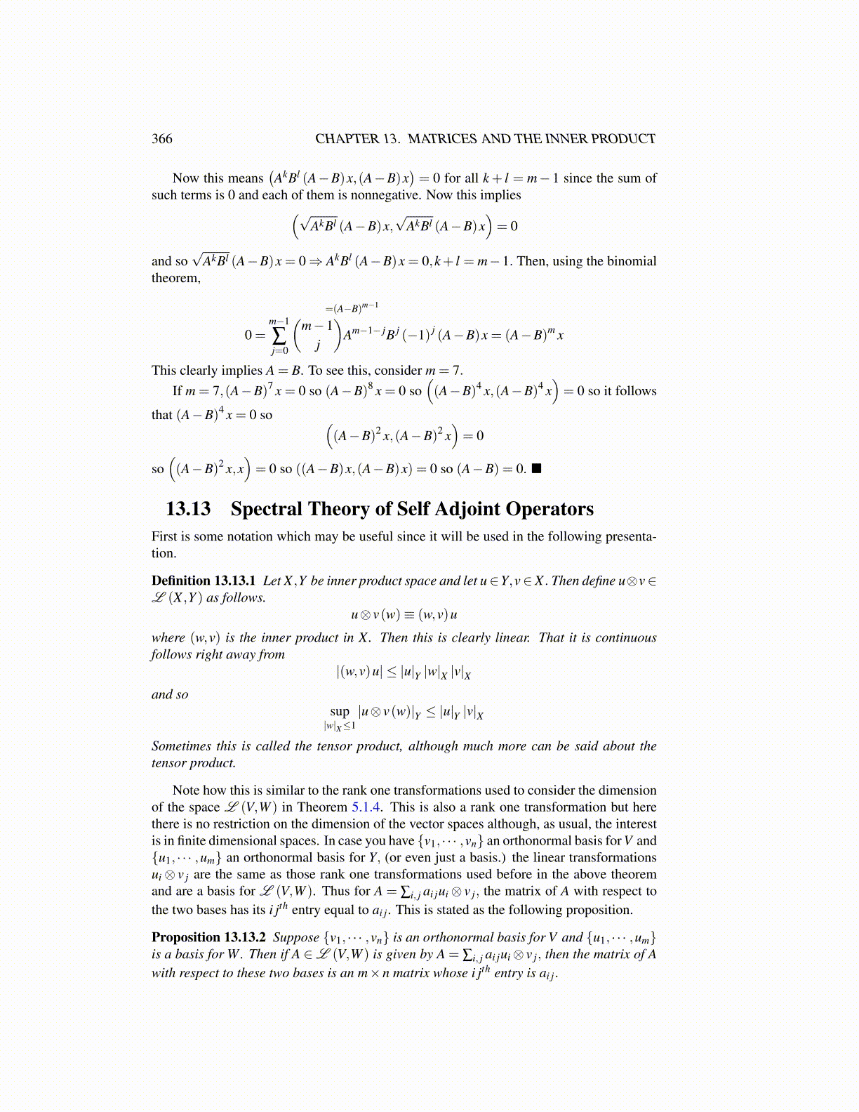 366 CHAPTER 13. MATRICES AND THE INNER PRODUCTNow this means (A‘B! (A — B).x,(A—B)x) =0 for all k+/ =m-—1 since the sum ofsuch terms is 0 and each of them is nonnegative. Now this implies(vat! (A—B)x, VAKBI (A — B)x) =0and so VA‘B! (A — B)x = 0 = A‘B! (A —B)x =0,k +1 =m-—1. Then, using the binomialtheorem,=(A—B)""!mi m—1 foe .0 F(a ial —ays= 4-2)"jo \ JThis clearly implies A = B. To see this, consider m = 7.If m=7,(A—B)'x=0s0 (A—B)*x =0 so ((A —B)*x,(A ~B)'x) = 0 so it followsthat (A —B)*x=0 so((4 —B)?x,(A — Bx) =0$0 ((A-B)*x,x) =0 so ((A—B).x,(A—B)x) =0 so (A—B) =0.13.13 Spectral Theory of Self Adjoint OperatorsFirst is some notation which may be useful since it will be used in the following presenta-tion.Definition 13.13.1 Let X,Y be inner product space and letu € Y,v € X. Then define u®v €L (X,Y) as follows.u®v(w) =(w,v)uwhere (w,v) is the inner product in X. Then this is clearly linear. That it is continuousfollows right away from\(w,v) ul < July [wy |vlyand sosup |u@v(w)|y < |uly |vlx|wly SlSometimes this is called the tensor product, although much more can be said about thetensor product.Note how this is similar to the rank one transformations used to consider the dimensionof the space £(V,W) in Theorem 5.1.4. This is also a rank one transformation but herethere is no restriction on the dimension of the vector spaces although, as usual, the interestis in finite dimensional spaces. In case you have {v1,--- ,¥,} an orthonormal basis for V and{u1,+++ Um} an orthonormal basis for Y, (or even just a basis.) the linear transformationsu; ® vj; are the same as those rank one transformations used before in the above theoremand are a basis for “(V,W). Thus for A = ¥); ; a;ju;@vj, the matrix of A with respect tothe two bases has its ij” entry equal to a; j- This is stated as the following proposition.Proposition 13.13.2 Suppose {v1,--- ,v,} is an orthonormal basis for V and {uy,--+ ,Um}is a basis for W. Then if A € £2 (V,W) is given by A = J; ;ajjuj @ vj, then the matrix of Awith respect to these two bases is an m Xn matrix whose ij” entry is aij.