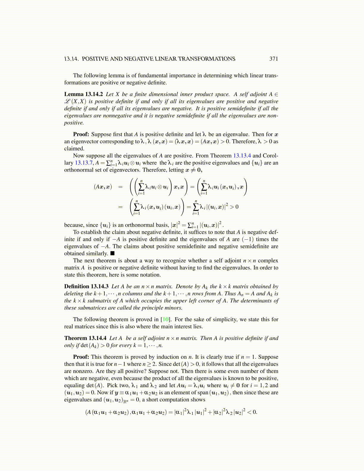 Lemma 13.14.2 Let X be a finite dimensional inner product space. A self adjoint A ∈L (X ,X) is positive definite if and only if all its eigenvalues are positive and negativedefinite if and only if all its eigenvalues are negative. It is positive semidefinite if all theeigenvalues are nonnegative and it is negative semidefinite if all the eigenvalues are non-positive.