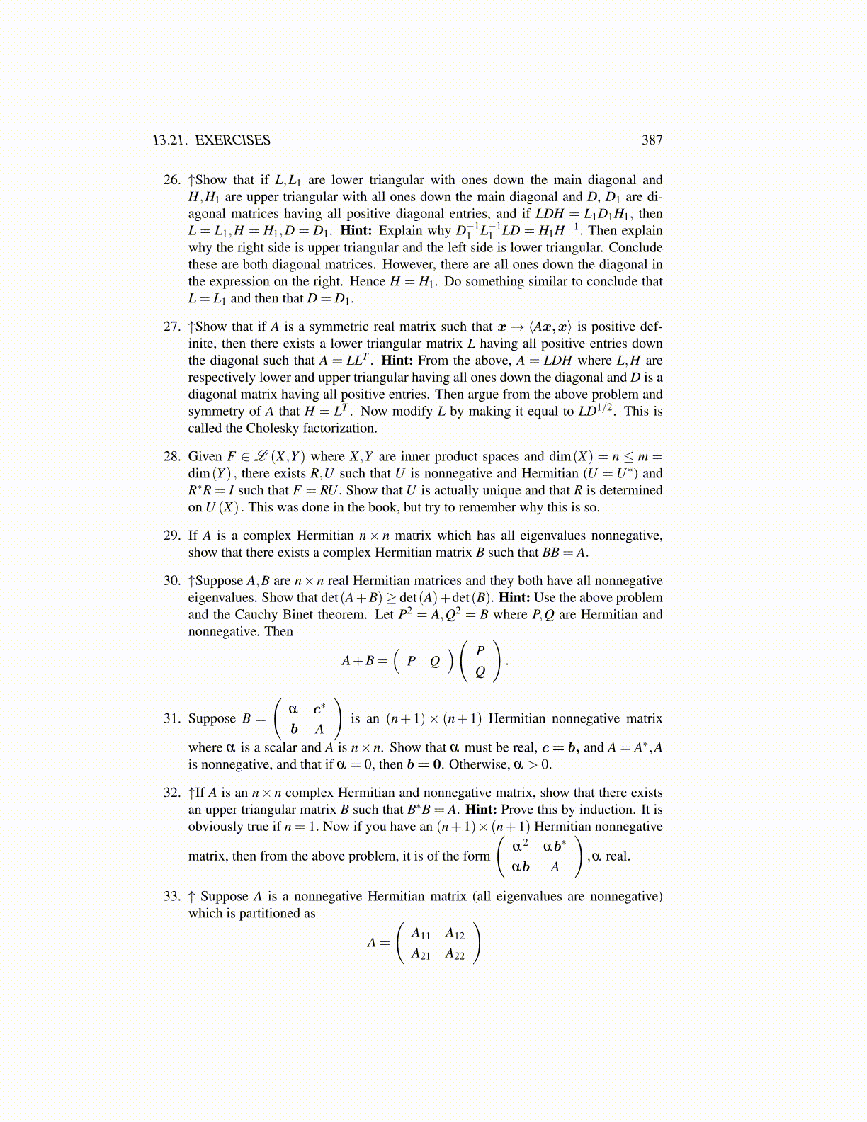 32. ↑If A is an n× n complex Hermitian and nonnegative matrix, show that there existsan upper triangular matrix B such that B∗B = A. Hint: Prove this by induction. It isobviously true if n = 1. Now if you have an (n+1)× (n+1) Hermitian nonnegative