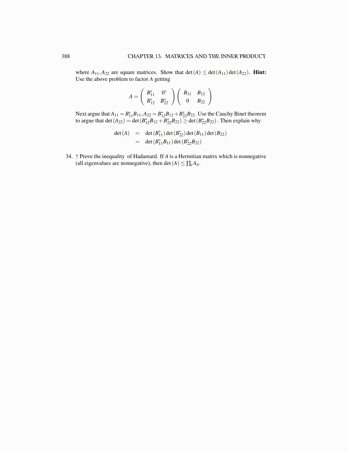 34. ↑ Prove the inequality of Hadamard. If A is a Hermitian matrix which is nonnegative(all eigenvalues are nonnegative), then det(A)≤∏i Aii.