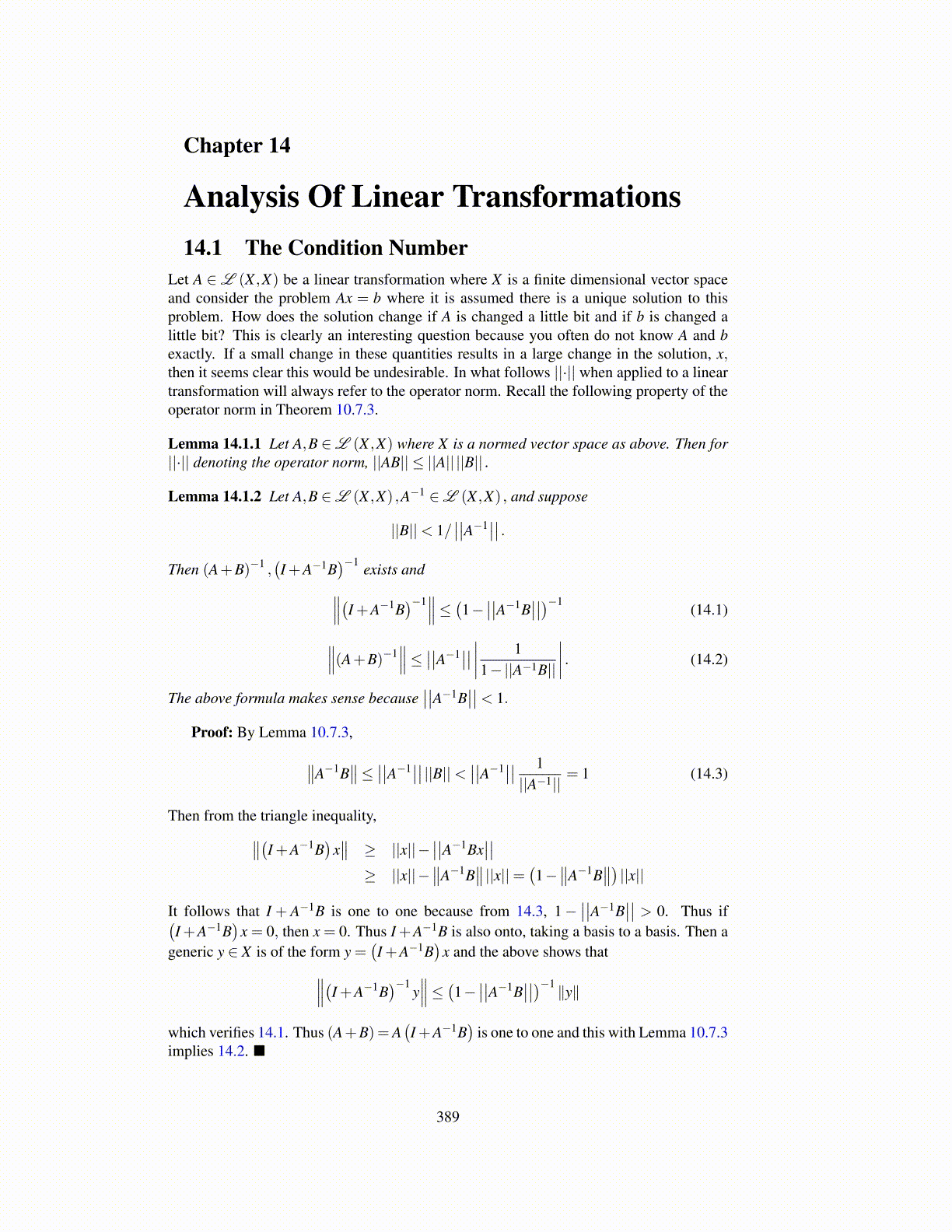 Let A ∈L (X ,X) be a linear transformation where X is a finite dimensional vector spaceand consider the problem Ax = b where it is assumed there is a unique solution to thisproblem. How does the solution change if A is changed a little bit and if b is changed alittle bit? This is clearly an interesting question because you often do not know A and bexactly. If a small change in these quantities results in a large change in the solution, x,then it seems clear this would be undesirable. In what follows ||·|| when applied to a lineartransformation will always refer to the operator norm. Recall the following property of theoperator norm in Theorem 10.7.3.