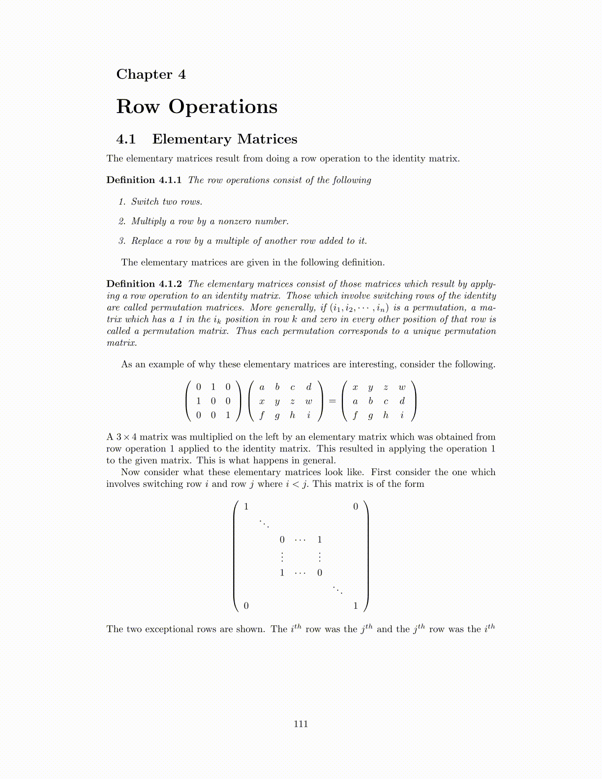 Definition 4.1.2 The elementary matrices consist of those matrices which result by apply-ing a row operation to an identity matrix. Those which involve switching rows of the identityare called permutation matrices. More generally, if (i1, i2, · · · , in) is a permutation, a ma-trix which has a 1 in the ik position in row k and zero in every other position of that row iscalled a permutation matrix. Thus each permutation corresponds to a unique permutationmatrix.