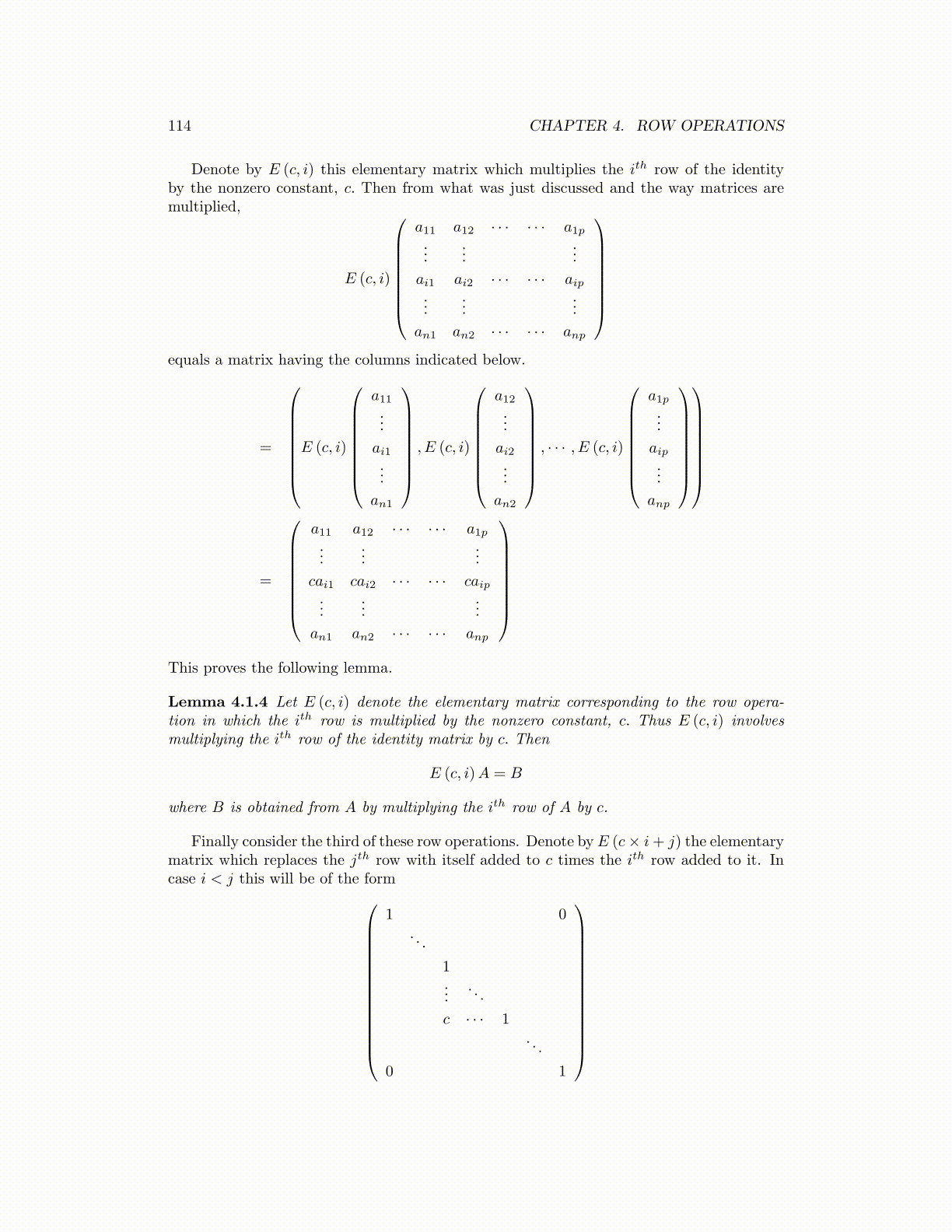 Lemma 4.1.4 Let E (c, i) denote the elementary matrix corresponding to the row opera-tion in which the ith row is multiplied by the nonzero constant, c. Thus E (c, i) involvesmultiplying the ith row of the identity matrix by c. Then