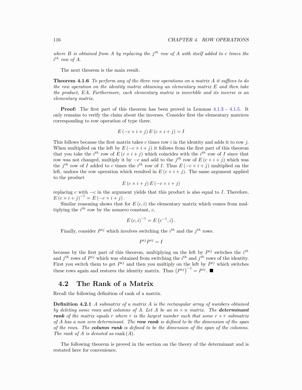 Theorem 4.1.6 To perform any of the three row operations on a matrix A it suffices to dothe row operation on the identity matrix obtaining an elementary matrix E and then takethe product, EA. Furthermore, each elementary matrix is invertible and its inverse is anelementary matrix.