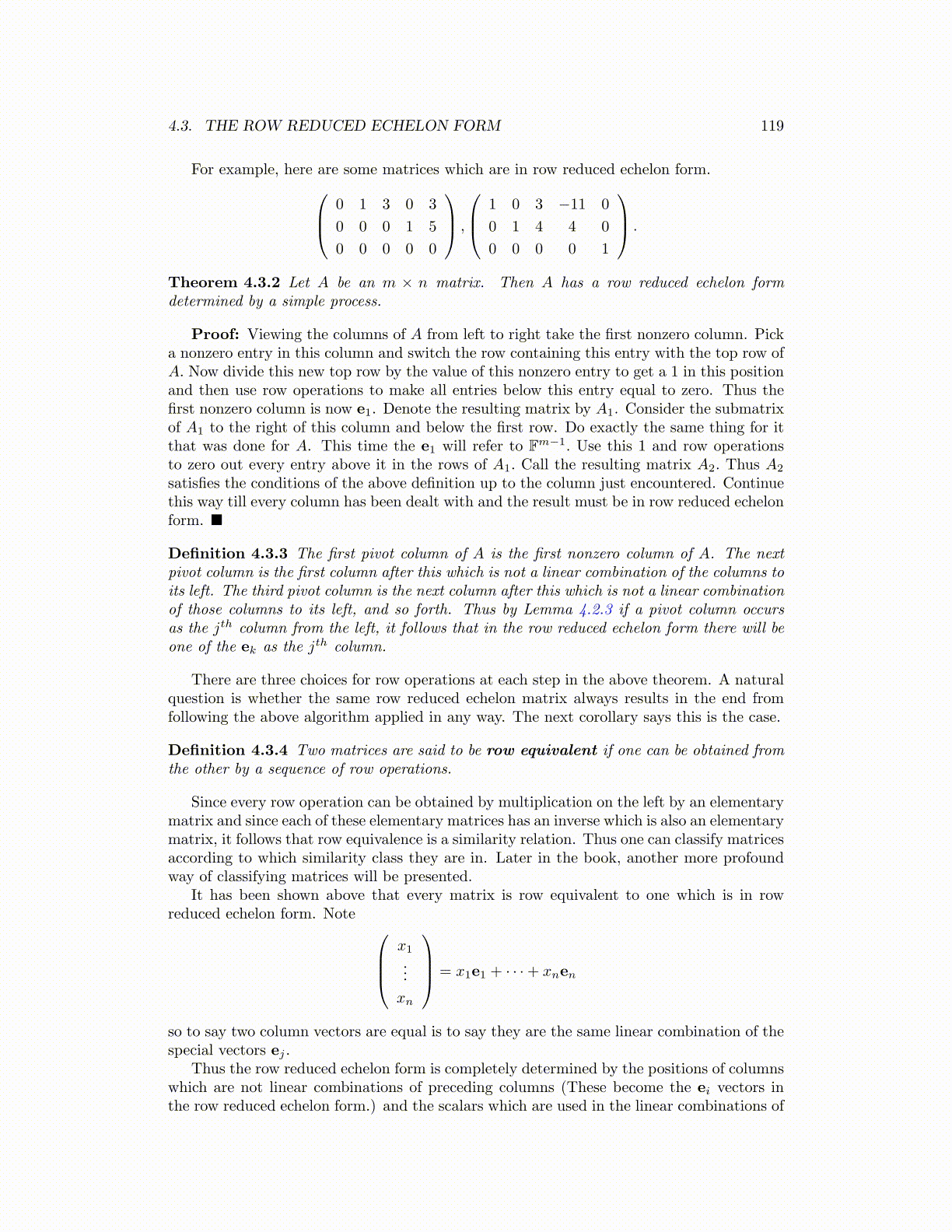 Definition 4.3.3 The first pivot column of A is the first nonzero column of A. The nextpivot column is the first column after this which is not a linear combination of the columns toits left. The third pivot column is the next column after this which is not a linear combinationof those columns to its left, and so forth. Thus by Lemma 4.2.3 if a pivot column occursas the jth column from the left, it follows that in the row reduced echelon form there will beone of the ek as the jth column.