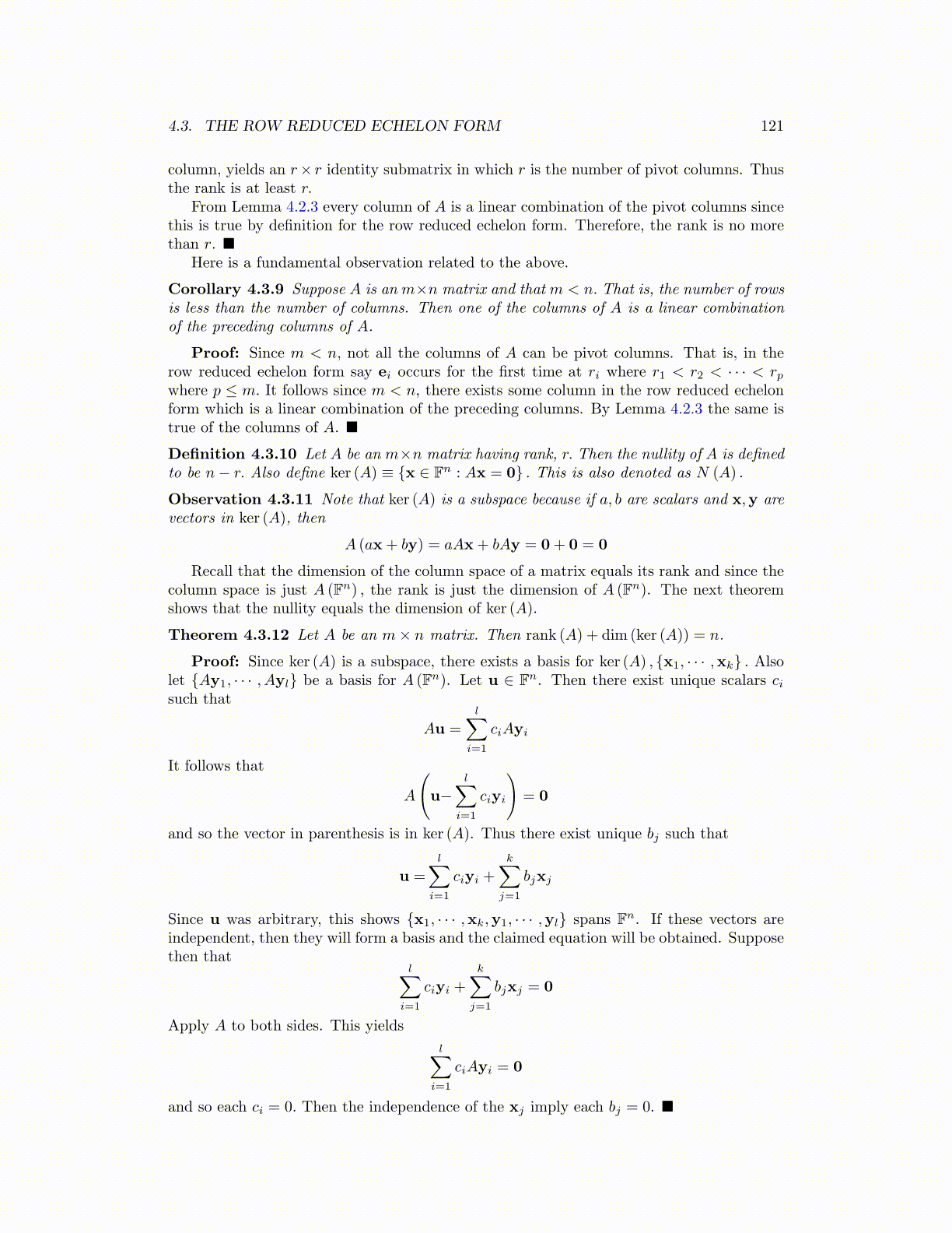 Definition 4.3.10 Let A be an m×n matrix having rank, r. Then the nullity of A is definedto be n− r. Also define ker (A) ≡ {x ∈ Fn : Ax = 0} . This is also denoted as N (A) .