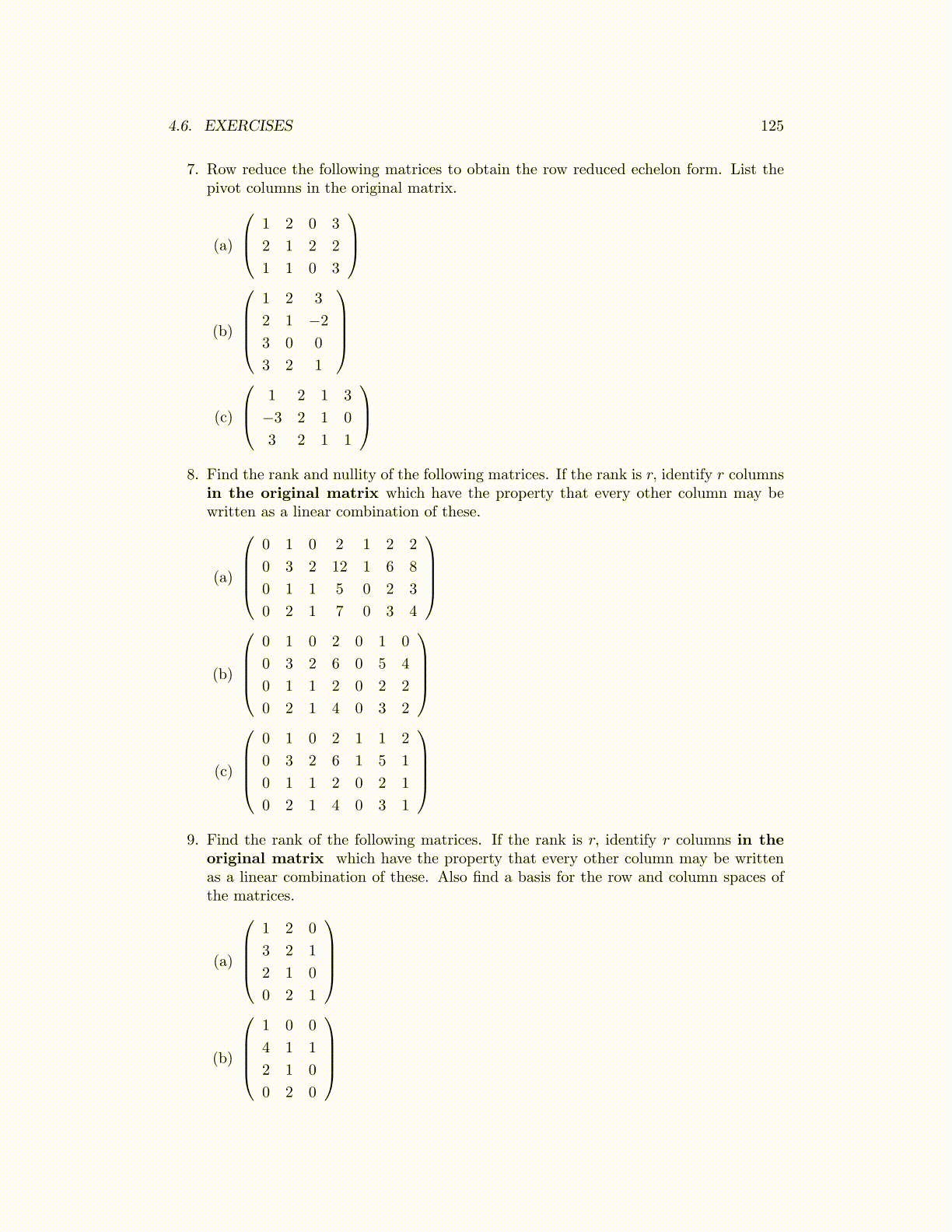 7. Row reduce the following matrices to obtain the row reduced echelon form. List thepivot columns in the original matrix.