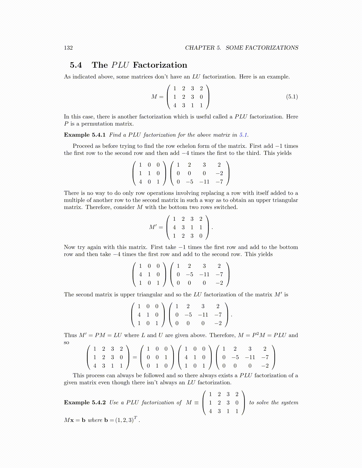 Example 5.4.2 Use a PLU factorization of M ≡