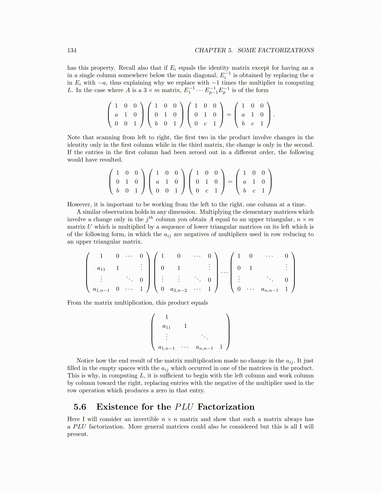 filled in the empty spaces with the aij which occurred in one of the matrices in the product.This is why, in computing L, it is sufficient to begin with the left column and work columnby column toward the right, replacing entries with the negative of the multiplier used in therow operation which produces a zero in that entry.