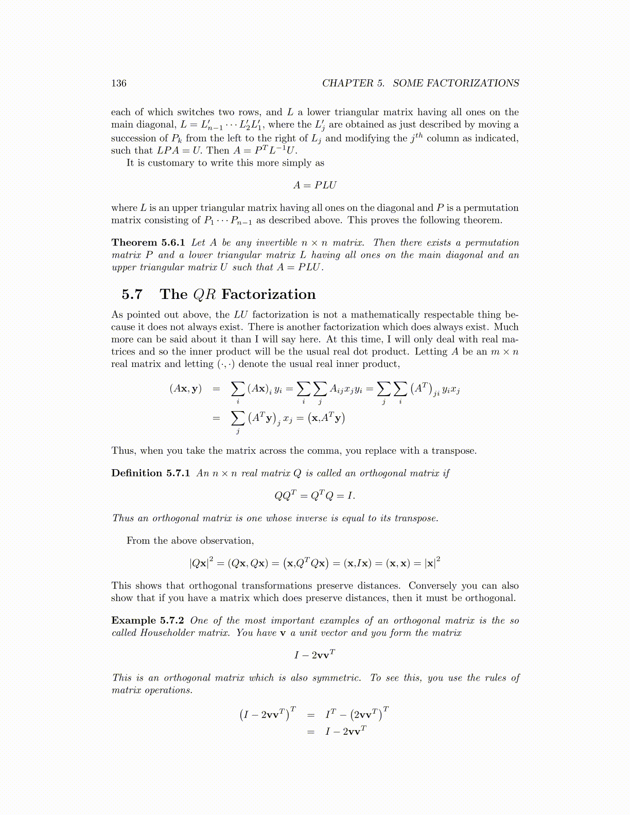 As pointed out above, the LU factorization is not a mathematically respectable thing be-cause it does not always exist. There is another factorization which does always exist. Muchmore can be said about it than I will say here. At this time, I will only deal with real ma-trices and so the inner product will be the usual real dot product. Letting A be an m × nreal matrix and letting (·, ·) denote the usual real inner product,