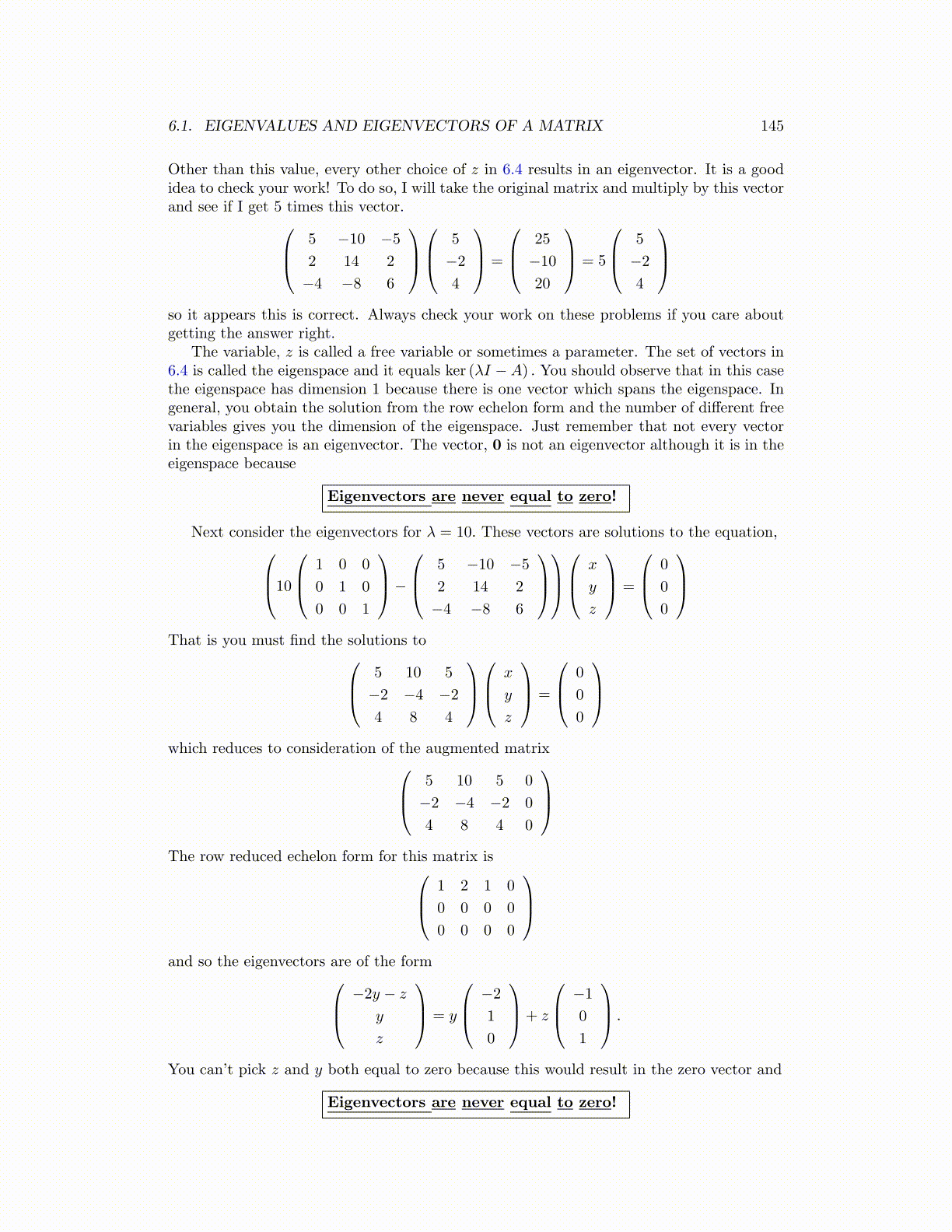The variable, z is called a free variable or sometimes a parameter. The set of vectors in6.4 is called the eigenspace and it equals ker (λI −A) . You should observe that in this casethe eigenspace has dimension 1 because there is one vector which spans the eigenspace. Ingeneral, you obtain the solution from the row echelon form and the number of different freevariables gives you the dimension of the eigenspace. Just remember that not every vectorin the eigenspace is an eigenvector. The vector, 0 is not an eigenvector although it is in theeigenspace because