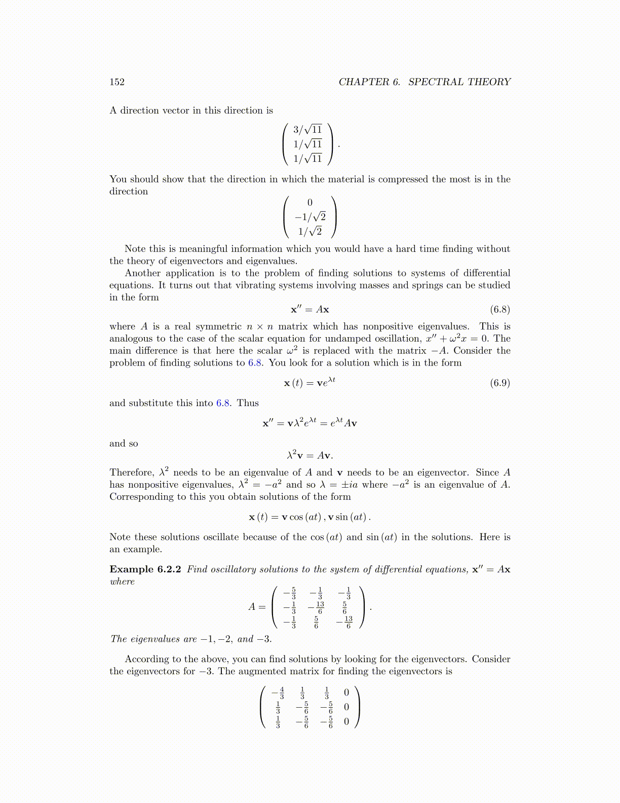 where A is a real symmetric n × n matrix which has nonpositive eigenvalues. This isanalogous to the case of the scalar equation for undamped oscillation, x′′ + ω2x = 0. Themain difference is that here the scalar ω2 is replaced with the matrix −A. Consider theproblem of finding solutions to 6.8. You look for a solution which is in the form