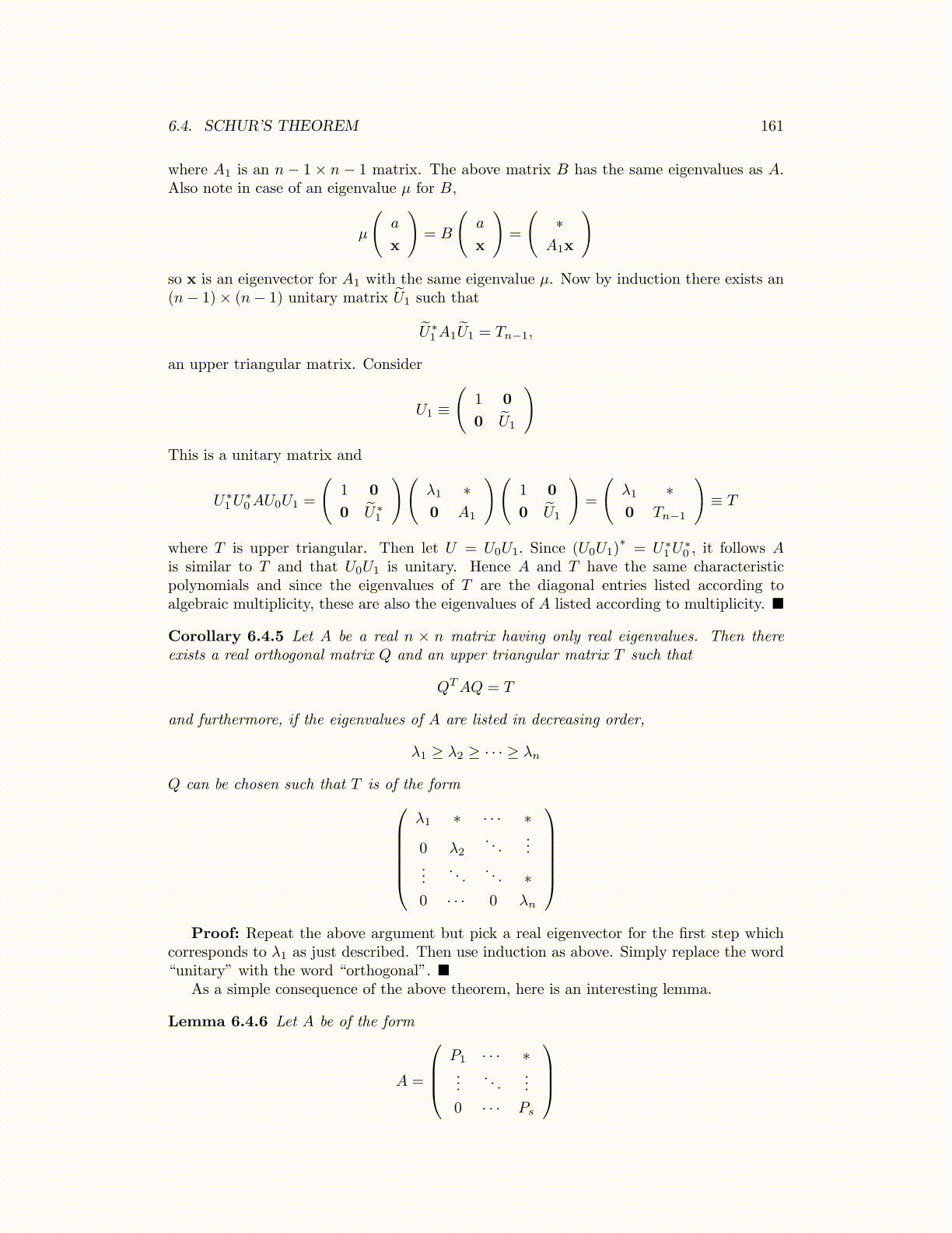 Corollary 6.4.5 Let A be a real n × n matrix having only real eigenvalues. Then thereexists a real orthogonal matrix Q and an upper triangular matrix T such that