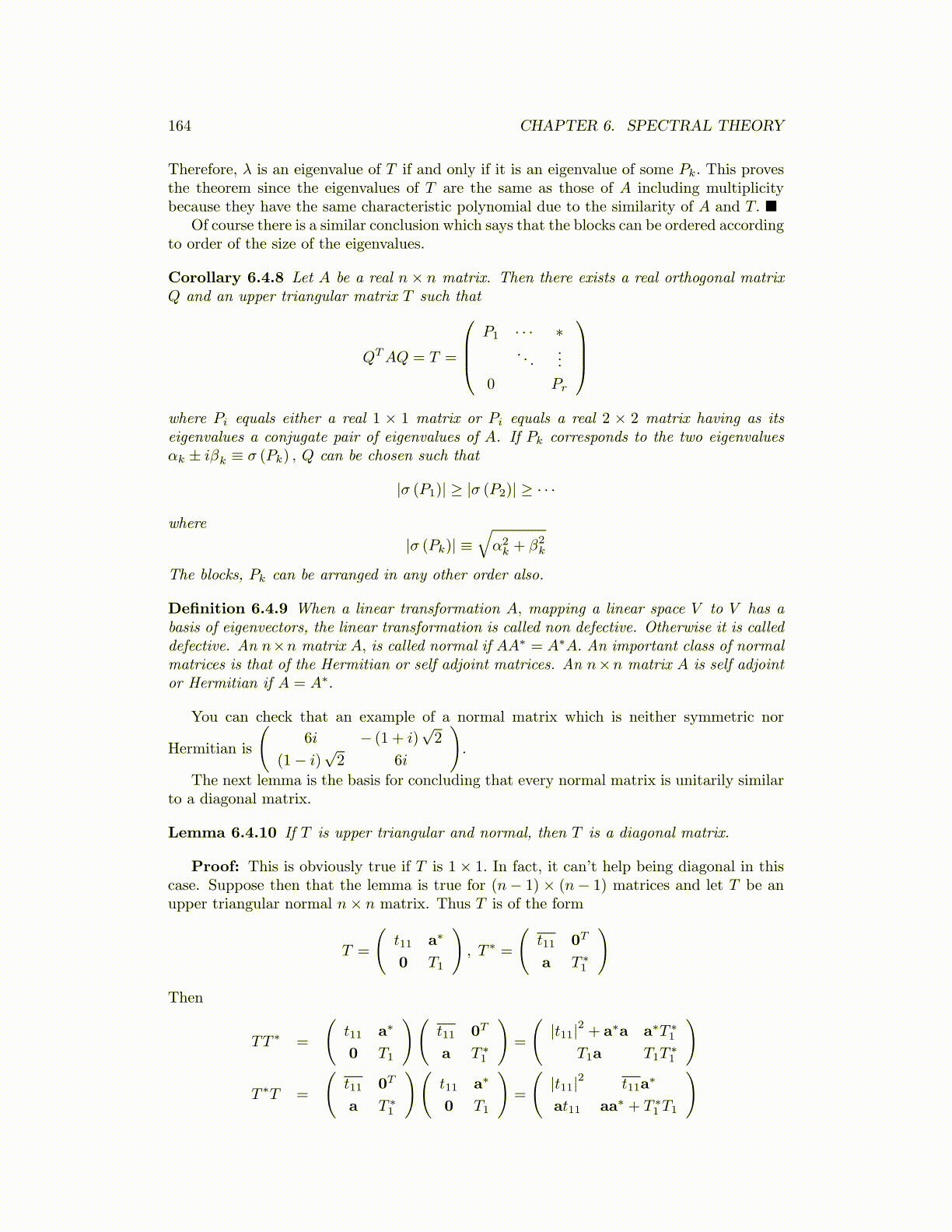Lemma 6.4.10 If T is upper triangular and normal, then T is a diagonal matrix.
