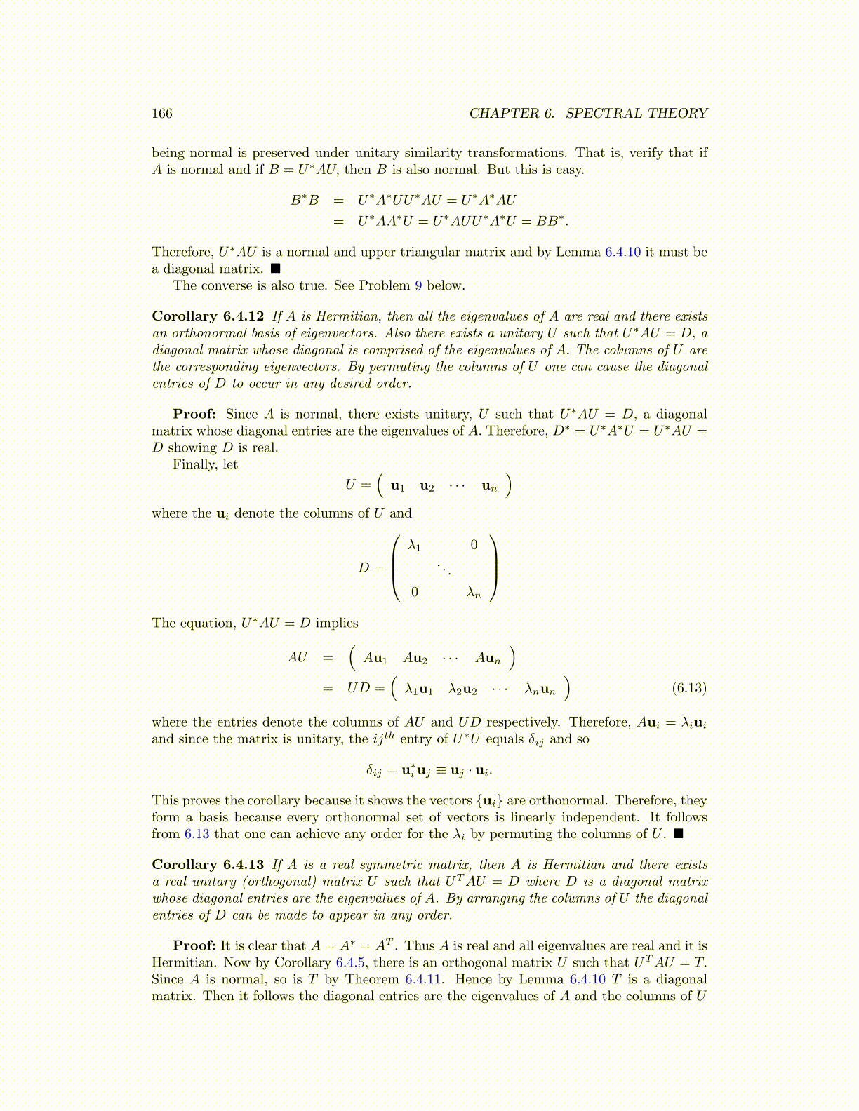 Corollary 6.4.13 If A is a real symmetric matrix, then A is Hermitian and there existsa real unitary (orthogonal) matrix U such that UTAU = D where D is a diagonal matrixwhose diagonal entries are the eigenvalues of A. By arranging the columns of U the diagonalentries of D can be made to appear in any order.