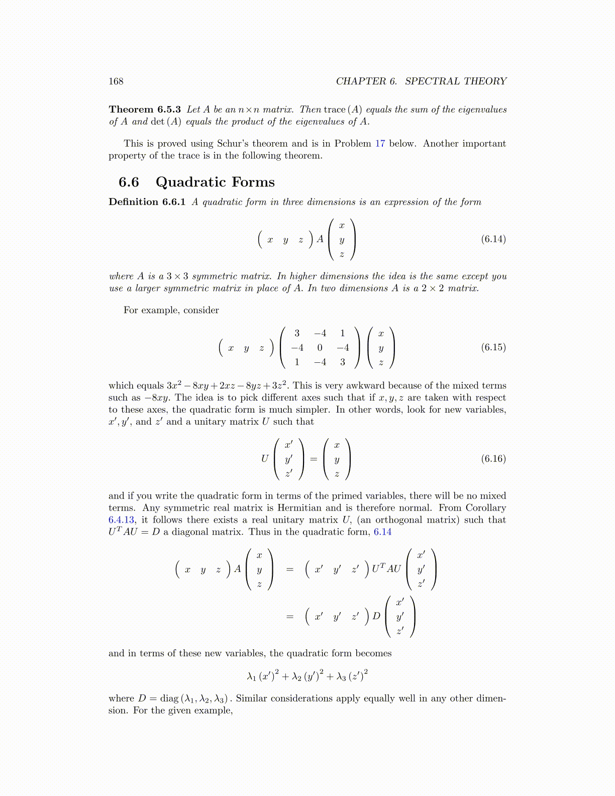 and if you write the quadratic form in terms of the primed variables, there will be no mixedterms. Any symmetric real matrix is Hermitian and is therefore normal. From Corollary6.4.13, it follows there exists a real unitary matrix U, (an orthogonal matrix) such thatUTAU = D a diagonal matrix. Thus in the quadratic form, 6.14