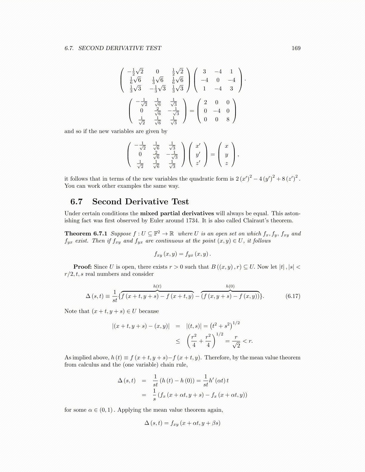 Theorem 6.7.1 Suppose f : U ⊆ F2 → R where U is an open set on which fx, fy, fxy andfyx exist. Then if fxy and fyx are continuous at the point (x, y) ∈ U , it follows