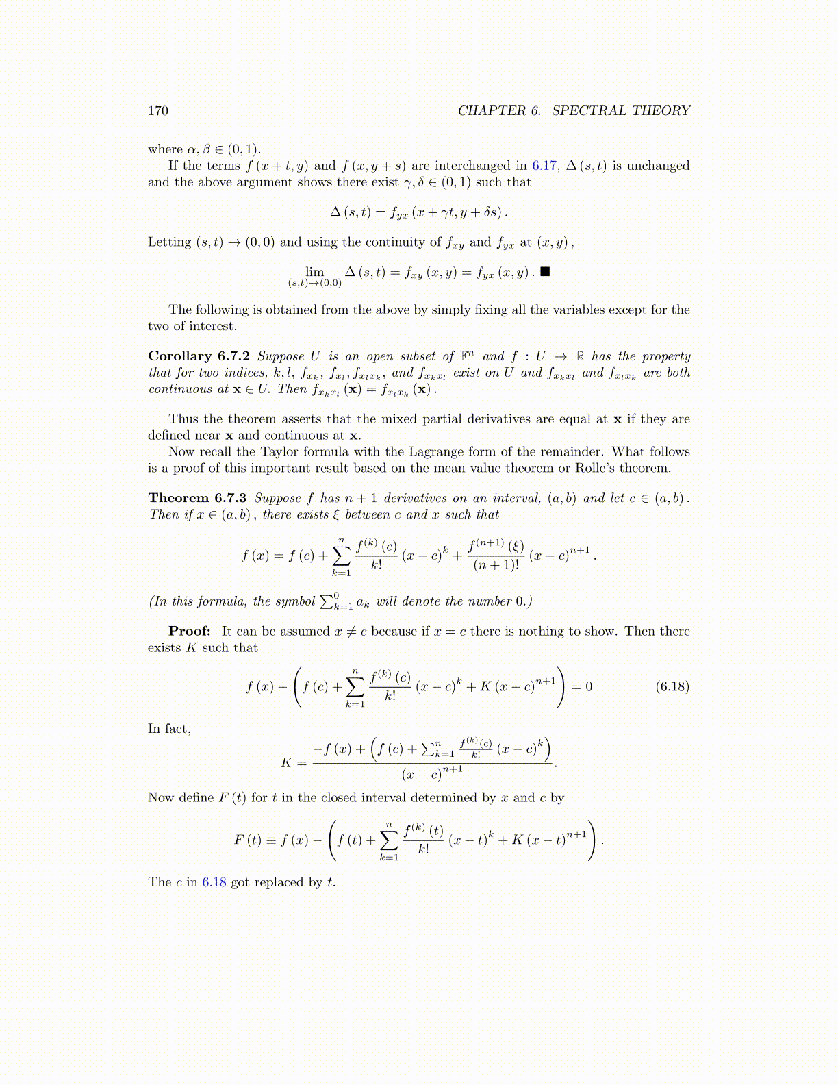 Theorem 6.7.3 Suppose f has n + 1 derivatives on an interval, (a, b) and let c ∈ (a, b) .Then if x ∈ (a, b) , there exists ξ between c and x such that