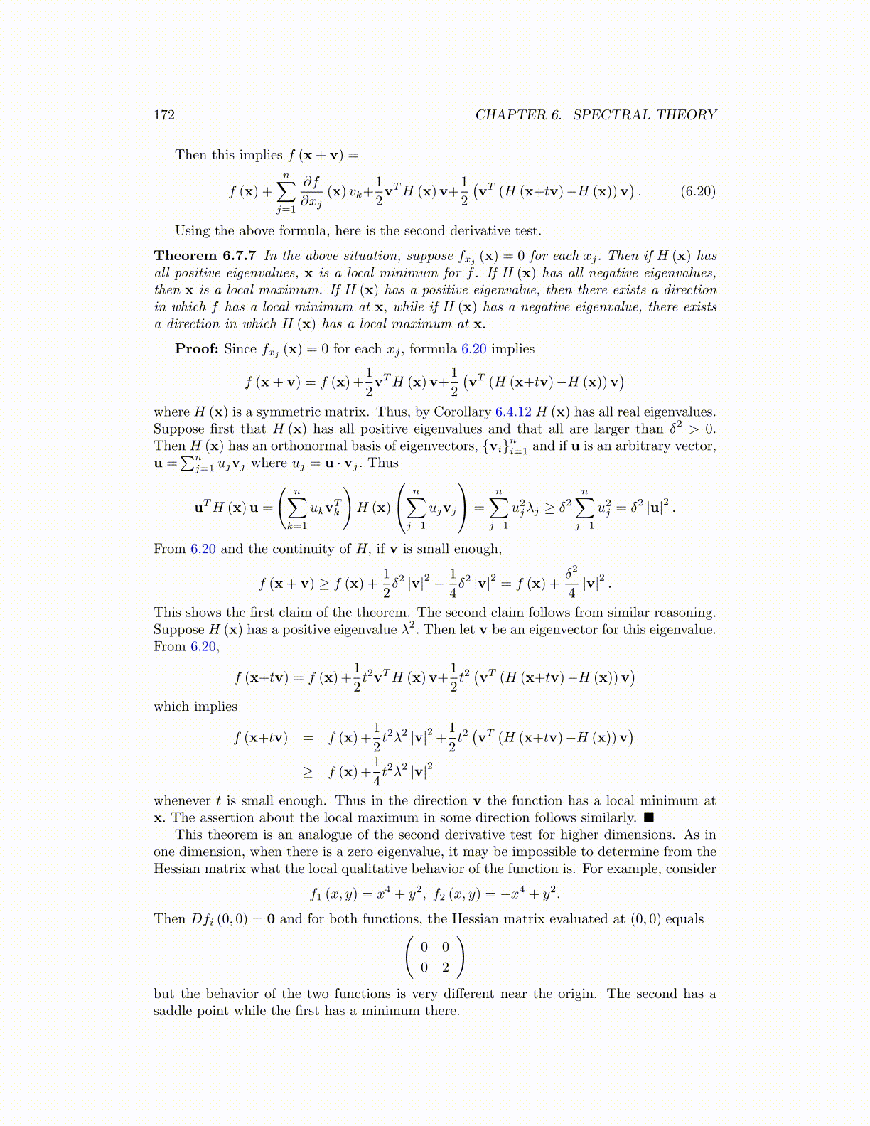 This theorem is an analogue of the second derivative test for higher dimensions. As inone dimension, when there is a zero eigenvalue, it may be impossible to determine from theHessian matrix what the local qualitative behavior of the function is. For example, consider