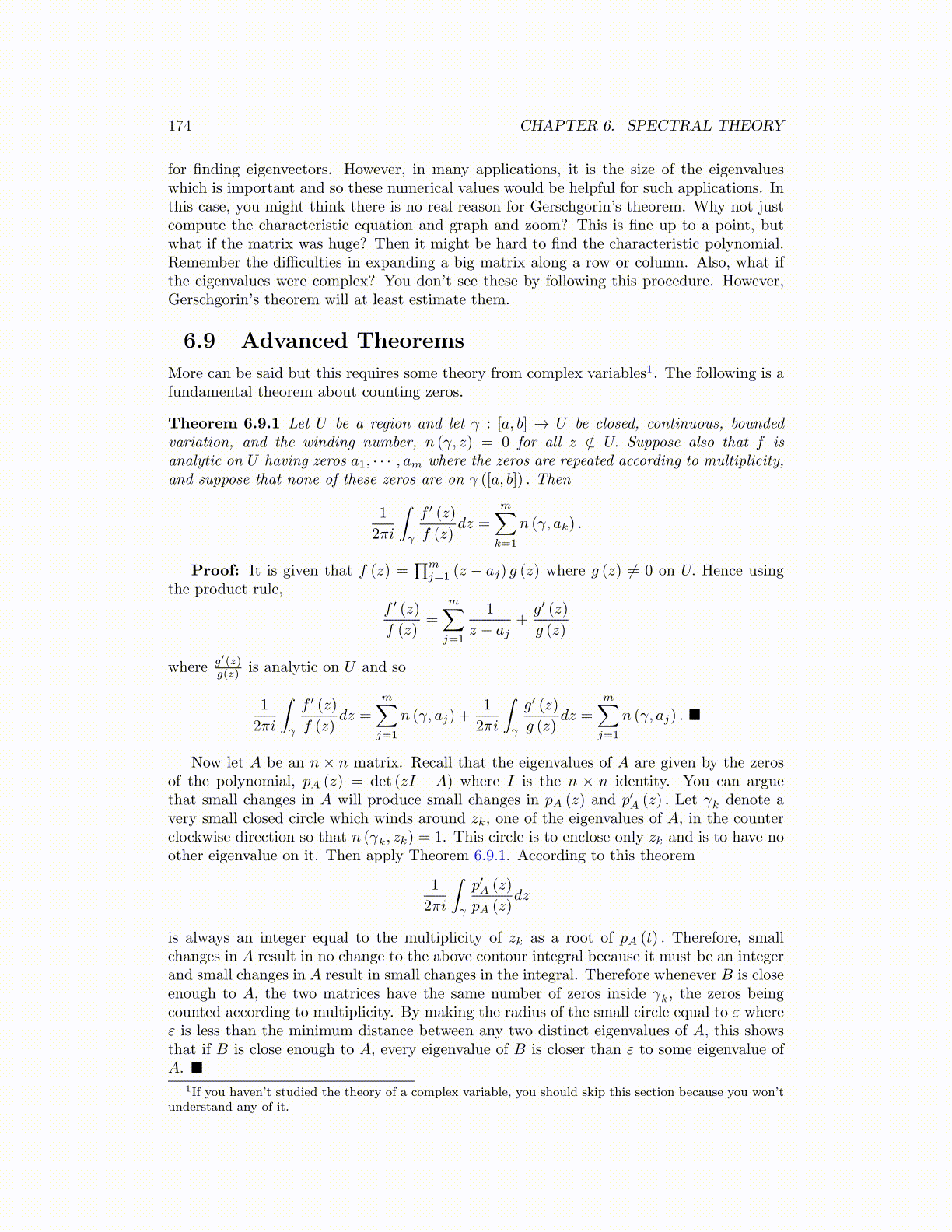 Now let A be an n × n matrix. Recall that the eigenvalues of A are given by the zerosof the polynomial, pA (z) = det (zI −A) where I is the n × n identity. You can arguethat small changes in A will produce small changes in pA (z) and p′A (z) . Let γk denote avery small closed circle which winds around zk, one of the eigenvalues of A, in the counterclockwise direction so that n (γk, zk) = 1. This circle is to enclose only zk and is to have noother eigenvalue on it. Then apply Theorem 6.9.1. According to this theorem