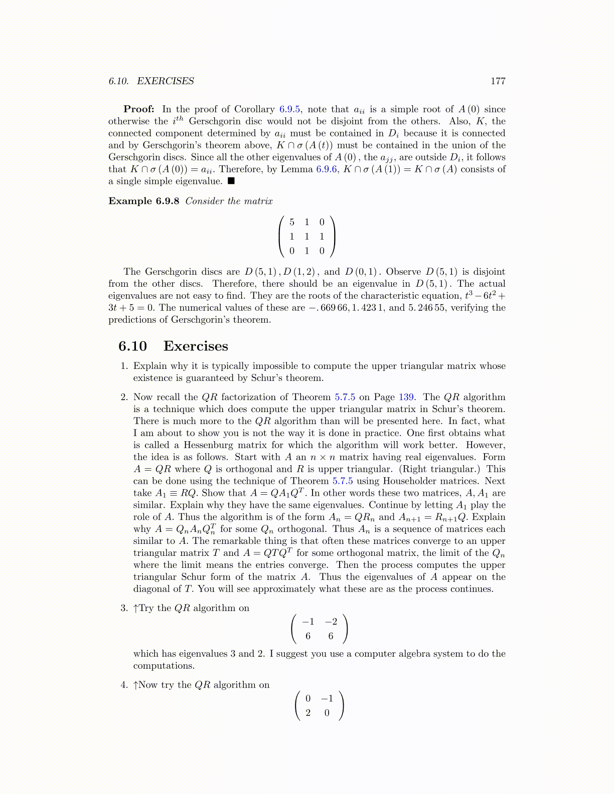 Proof: In the proof of Corollary 6.9.5, note that aii is a simple root of A (0) sinceotherwise the ith Gerschgorin disc would not be disjoint from the others. Also, K, theconnected component determined by aii must be contained in Di because it is connectedand by Gerschgorin’s theorem above, K ∩ σ (A (t)) must be contained in the union of theGerschgorin discs. Since all the other eigenvalues of A (0) , the ajj , are outside Di, it followsthat K ∩ σ (A (0)) = aii. Therefore, by Lemma 6.9.6, K ∩ σ (A (1)) = K ∩ σ (A) consists ofa single simple eigenvalue. ■