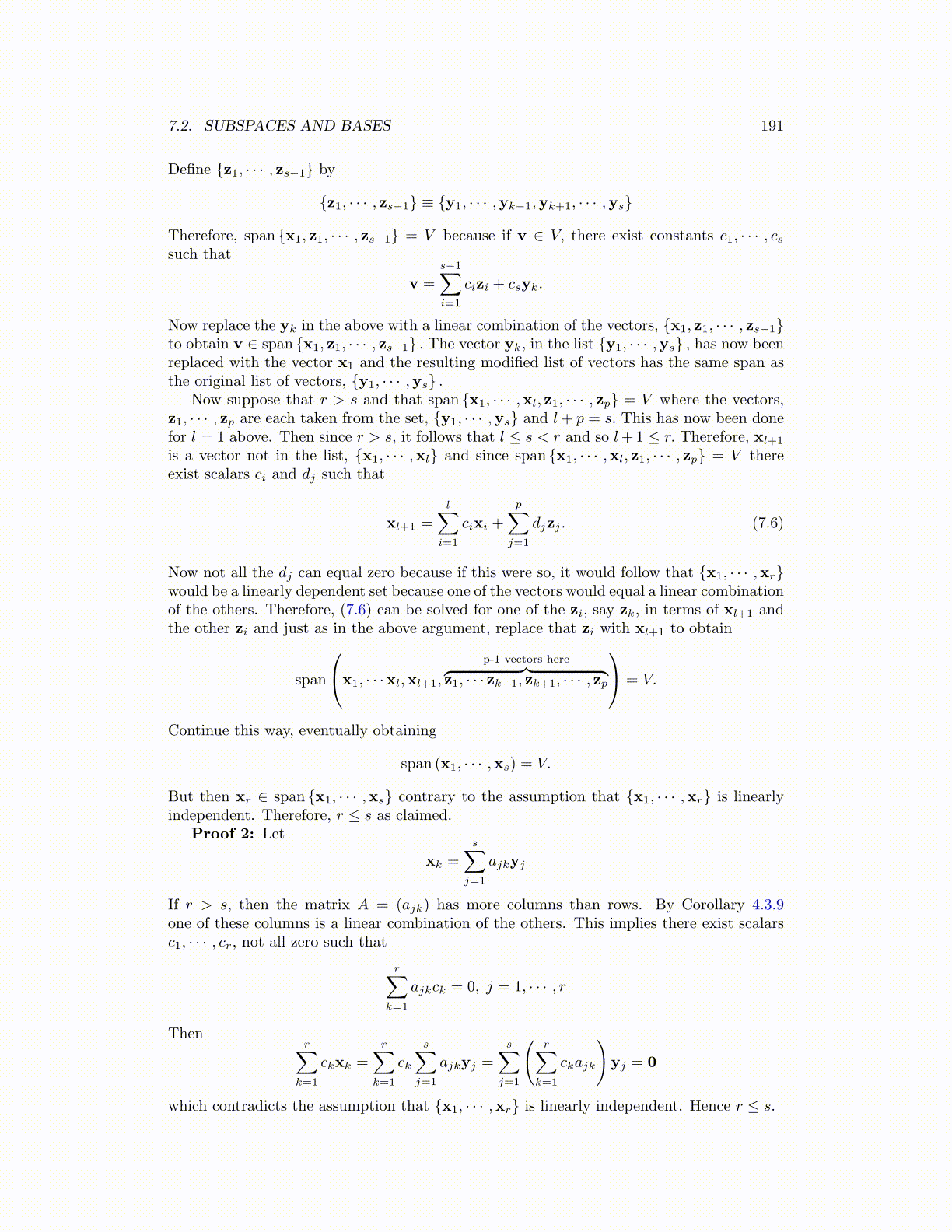 Now not all the dj can equal zero because if this were so, it would follow that {x1, · · · ,xr}would be a linearly dependent set because one of the vectors would equal a linear combinationof the others. Therefore, (7.6) can be solved for one of the zi, say zk, in terms of xl+1 andthe other zi and just as in the above argument, replace that zi with xl+1 to obtain