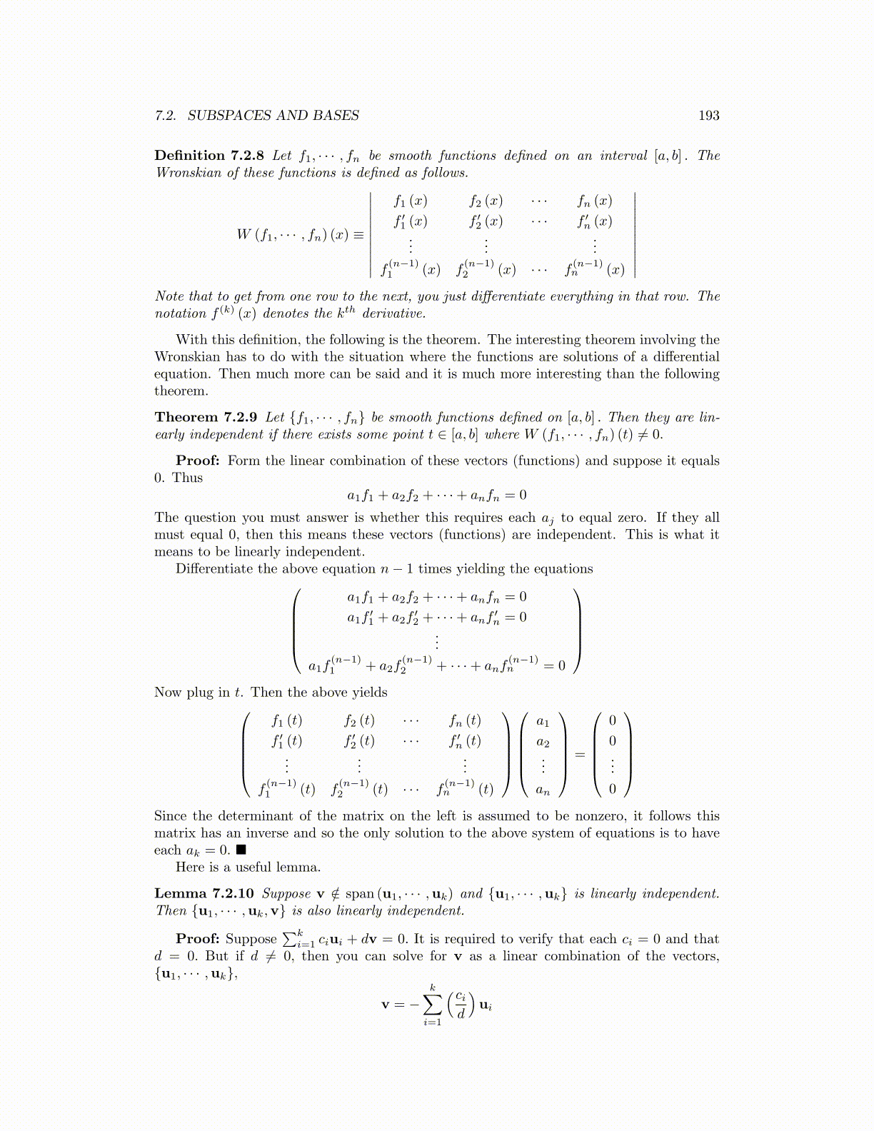 Theorem 7.2.9 Let {f1, · · · , fn} be smooth functions defined on [a, b] . Then they are lin-early independent if there exists some point t ∈ [a, b] where W (f1, · · · , fn) (t) ̸= 0.