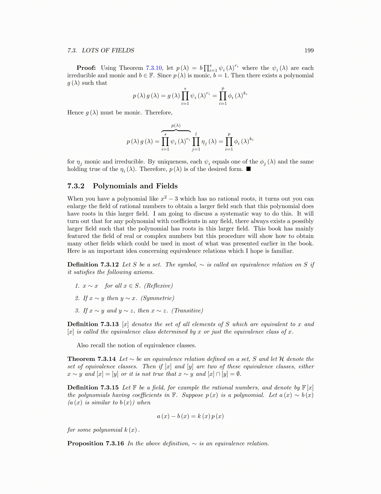 When you have a polynomial like x2 − 3 which has no rational roots, it turns out you canenlarge the field of rational numbers to obtain a larger field such that this polynomial doeshave roots in this larger field. I am going to discuss a systematic way to do this. It willturn out that for any polynomial with coefficients in any field, there always exists a possiblylarger field such that the polynomial has roots in this larger field. This book has mainlyfeatured the field of real or complex numbers but this procedure will show how to obtainmany other fields which could be used in most of what was presented earlier in the book.Here is an important idea concerning equivalence relations which I hope is familiar.
