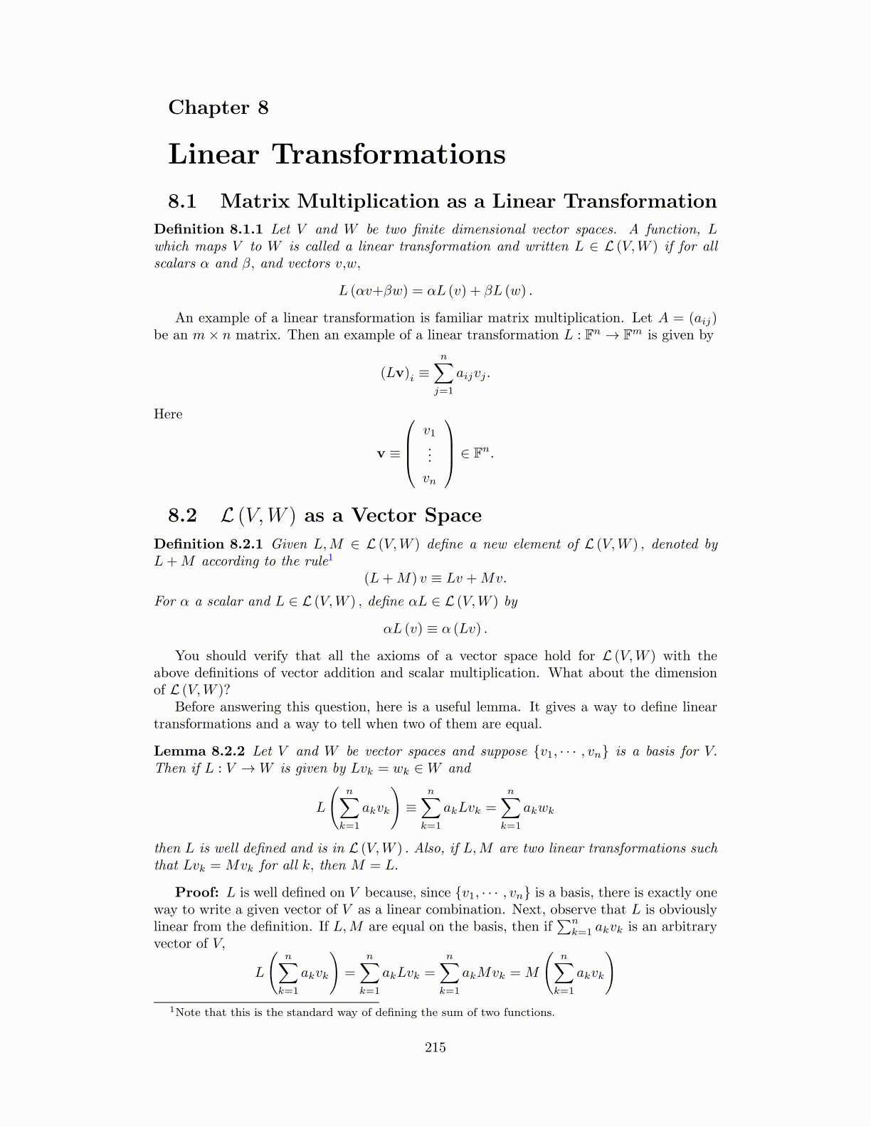 Definition 8.1.1 Let V and W be two finite dimensional vector spaces. A function, Lwhich maps V to W is called a linear transformation and written L ∈ L (V,W ) if for allscalars α and β, and vectors v,w,