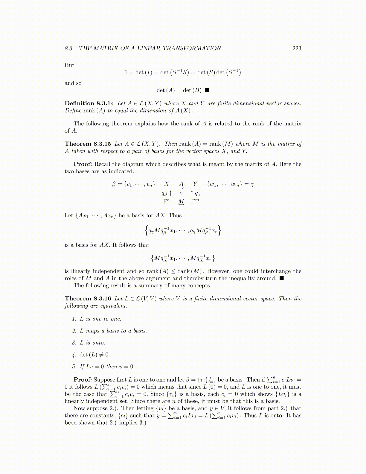 Theorem 8.3.15 Let A ∈ L (X,Y ). Then rank (A) = rank (M) where M is the matrix ofA taken with respect to a pair of bases for the vector spaces X, and Y.