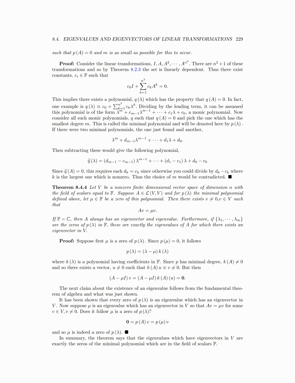 Theorem 8.4.4 Let V be a nonzero finite dimensional vector space of dimension n withthe field of scalars equal to F. Suppose A ∈ L (V, V ) and for p (λ) the minimal polynomialdefined above, let µ ∈ F be a zero of this polynomial. Then there exists v ̸= 0,v ∈ V suchthat
