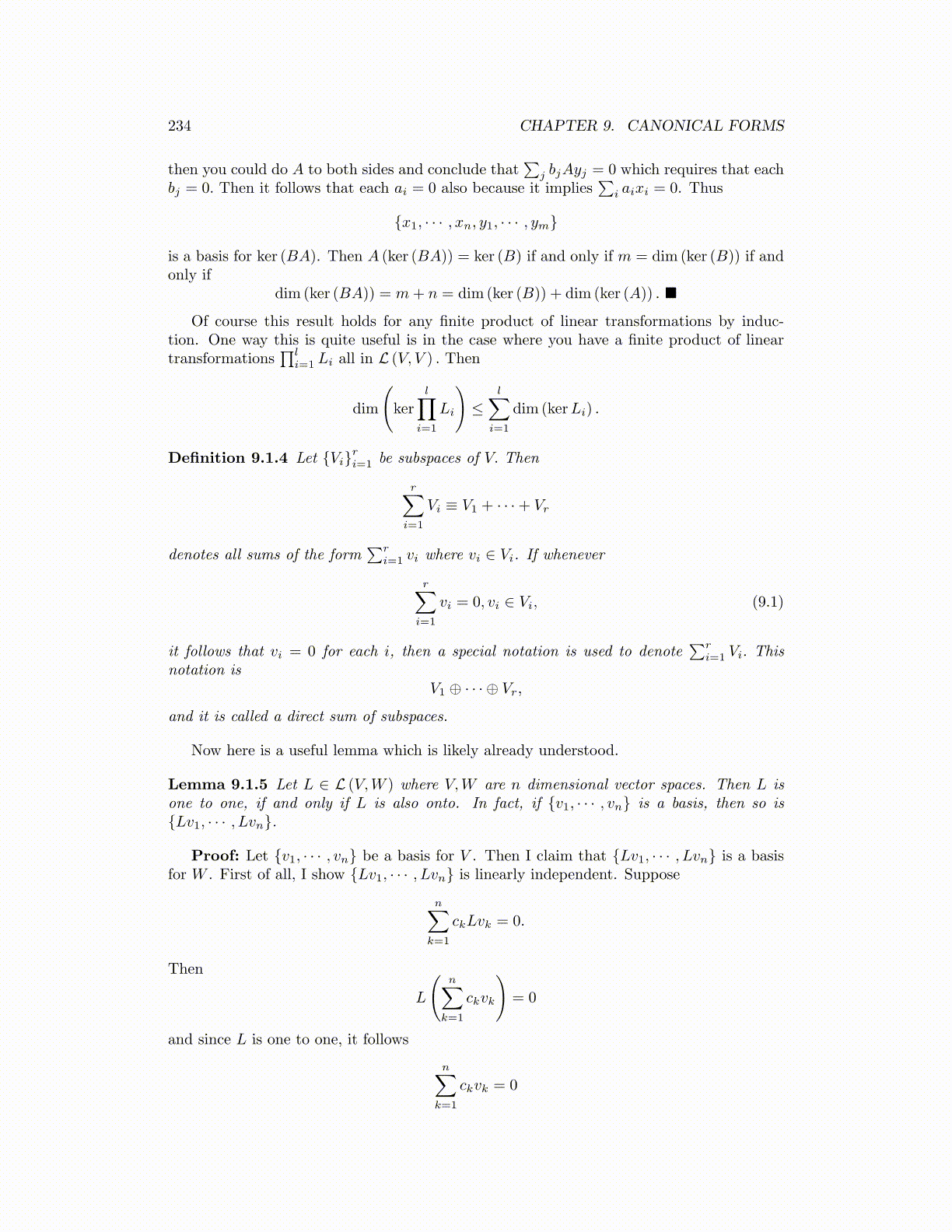 Lemma 9.1.5 Let L ∈ L (V,W ) where V,W are n dimensional vector spaces. Then L isone to one, if and only if L is also onto. In fact, if {v1, · · · , vn} is a basis, then so is{Lv1, · · · , Lvn}.