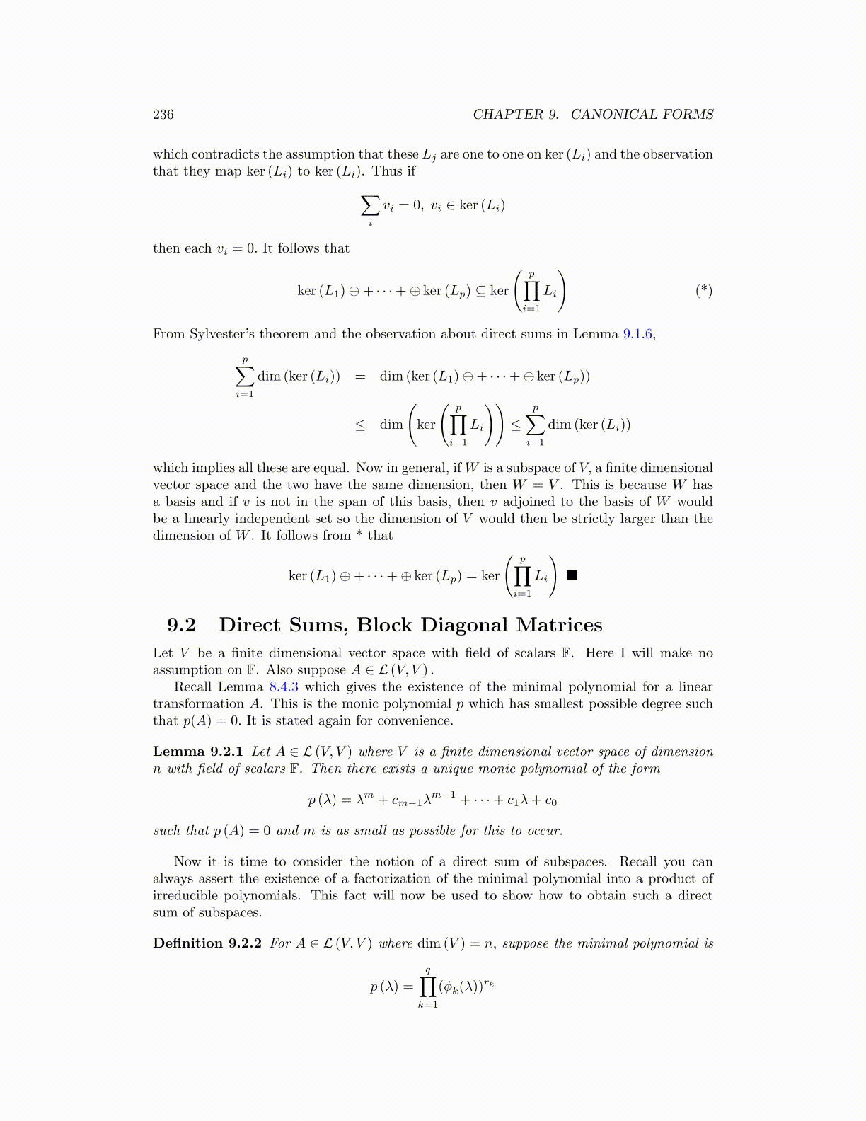 Recall Lemma 8.4.3 which gives the existence of the minimal polynomial for a lineartransformation A. This is the monic polynomial p which has smallest possible degree suchthat p(A) = 0. It is stated again for convenience.