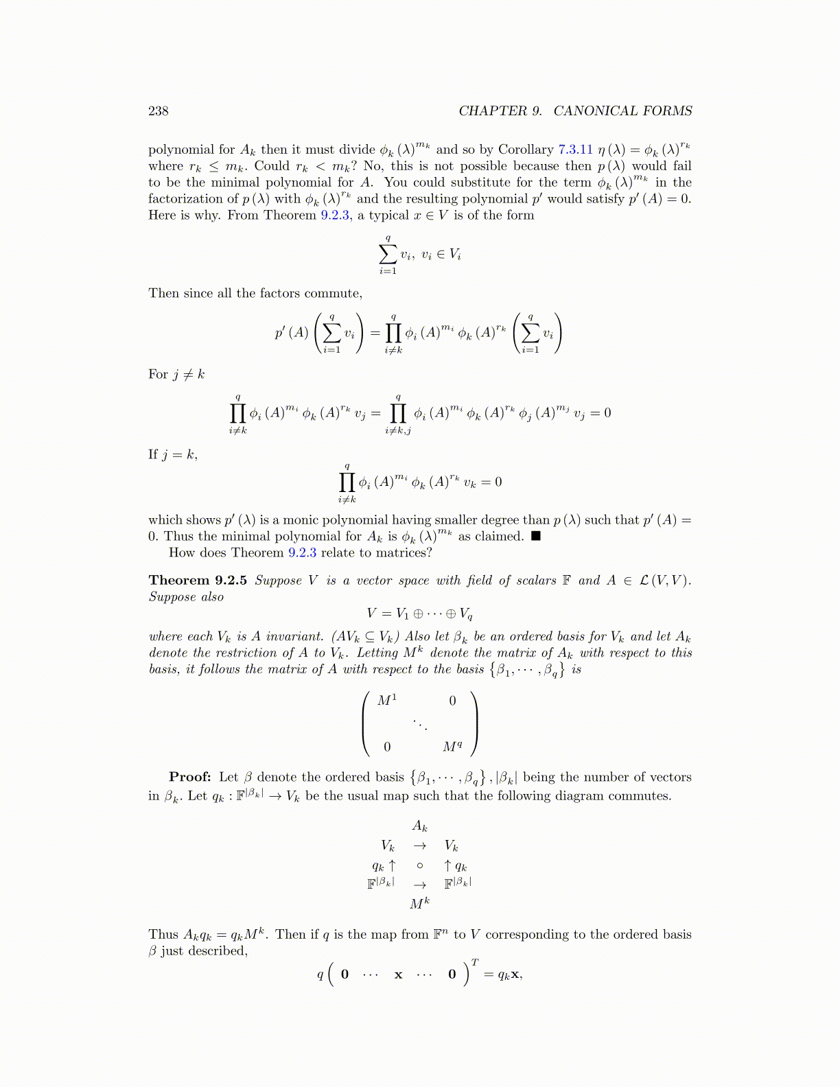 Theorem 9.2.5 Suppose V is a vector space with field of scalars F and A ∈ L (V, V ).Suppose also