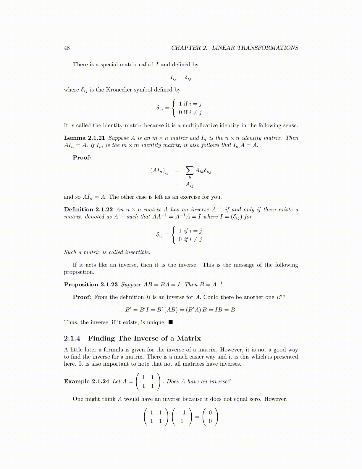 Lemma 2.1.21 Suppose A is an m× n matrix and In is the n× n identity matrix. ThenAIn = A. If Im is the m×m identity matrix, it also follows that ImA = A.