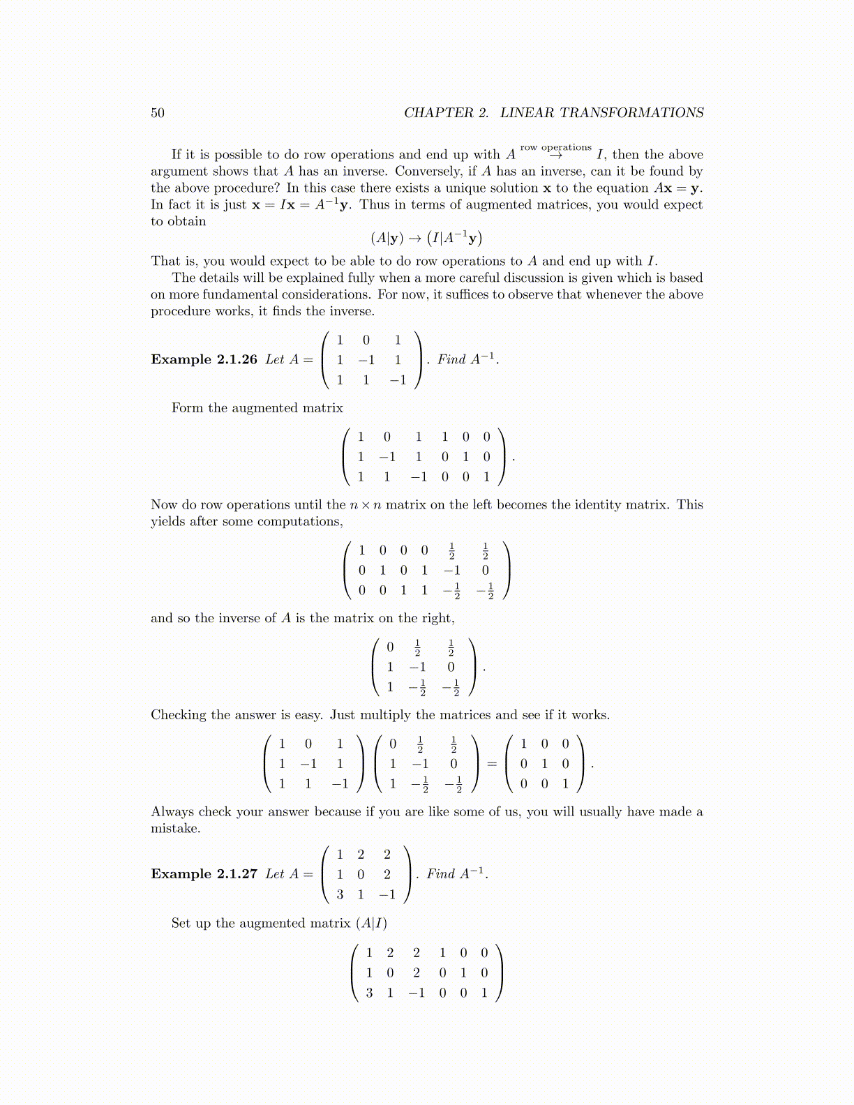 argument shows that A has an inverse. Conversely, if A has an inverse, can it be found bythe above procedure? In this case there exists a unique solution x to the equation Ax = y.In fact it is just x = Ix = A−1y. Thus in terms of augmented matrices, you would expectto obtain