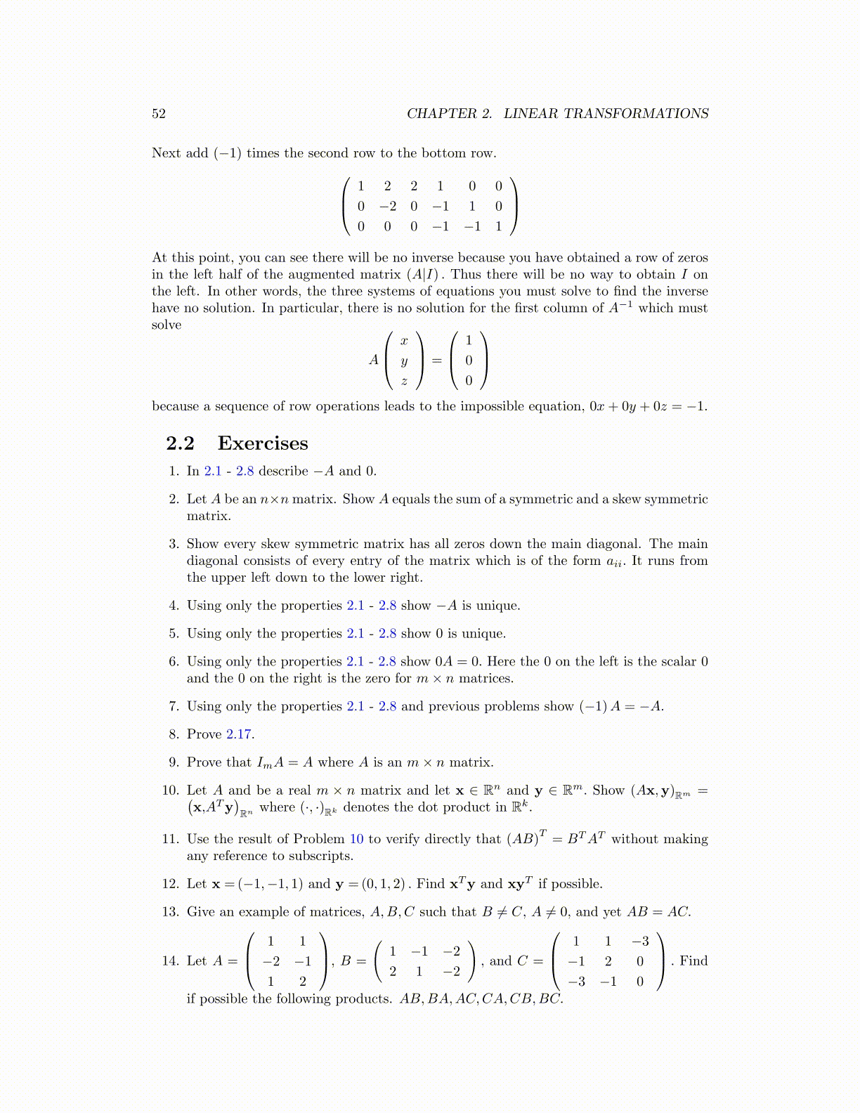 At this point, you can see there will be no inverse because you have obtained a row of zerosin the left half of the augmented matrix (A|I) . Thus there will be no way to obtain I onthe left. In other words, the three systems of equations you must solve to find the inversehave no solution. In particular, there is no solution for the first column of A−1 which mustsolve