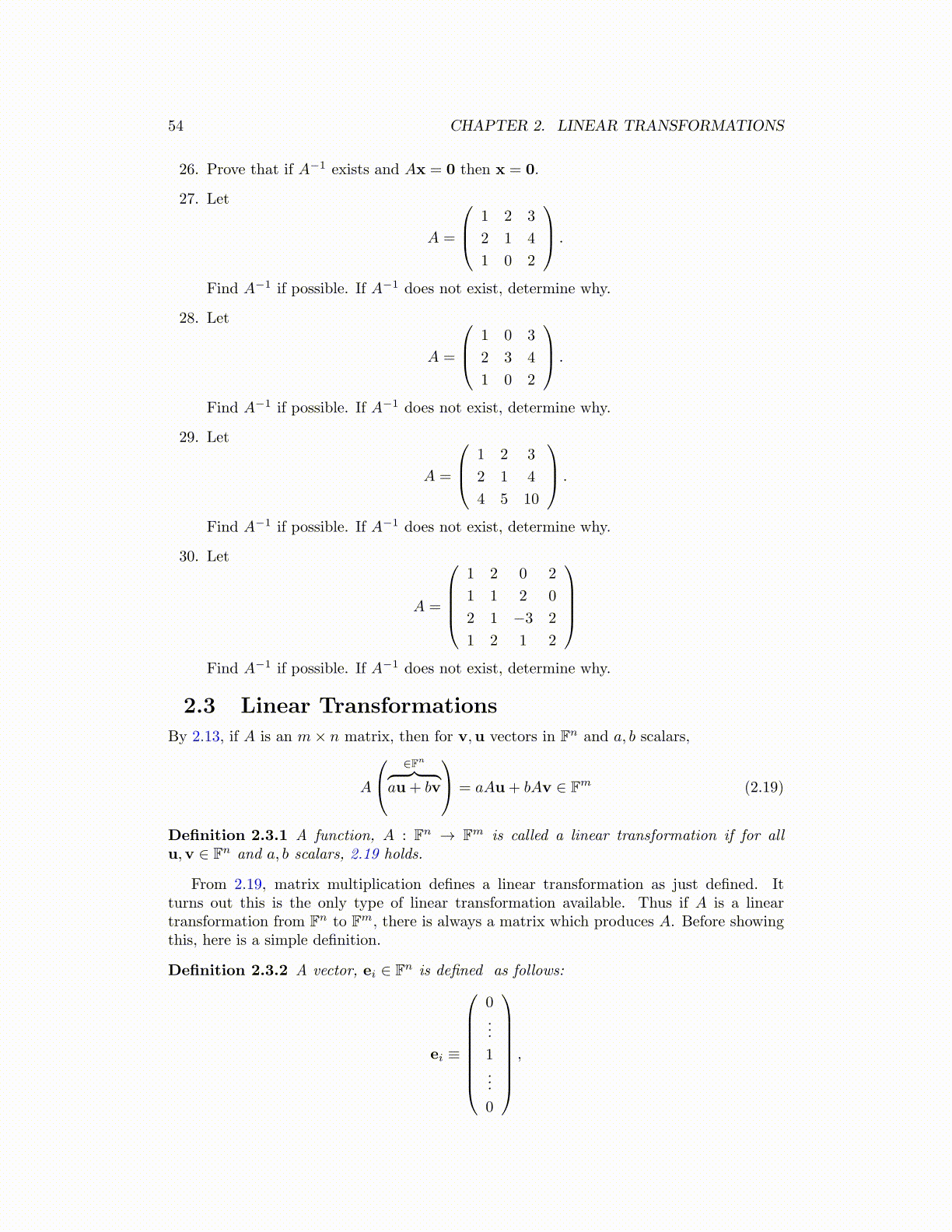 Definition 2.3.1 A function, A : Fn → Fm is called a linear transformation if for allu,v ∈ Fn and a, b scalars, 2.19 holds.