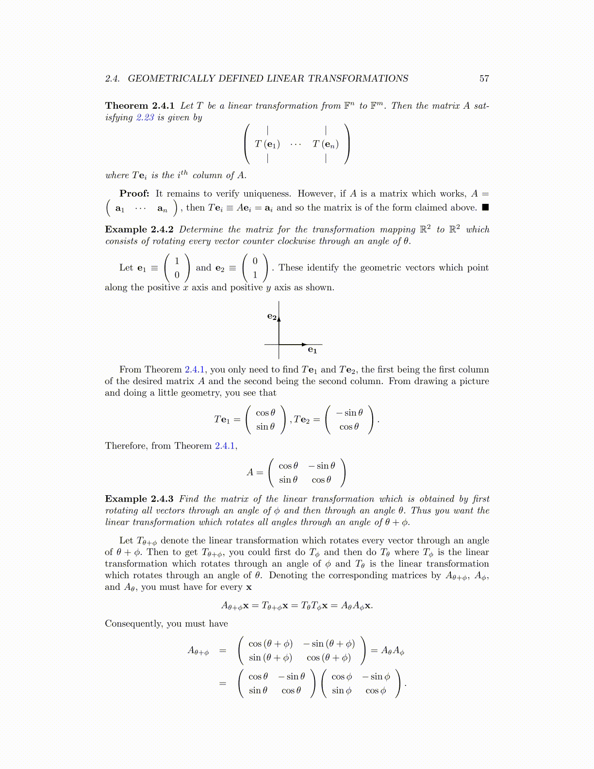 Example 2.4.2 Determine the matrix for the transformation mapping R2 to R2 whichconsists of rotating every vector counter clockwise through an angle of θ.