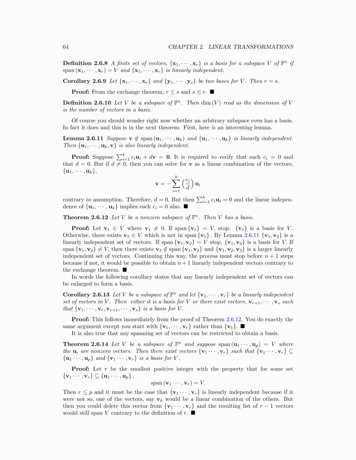 Theorem 2.6.14 Let V be a subspace of Fn and suppose span (u1 · · · ,up) = V wherethe ui are nonzero vectors. Then there exist vectors {v1 · · · ,vr} such that {v1 · · · ,vr} ⊆{u1 · · · ,up} and {v1 · · · ,vr} is a basis for V .