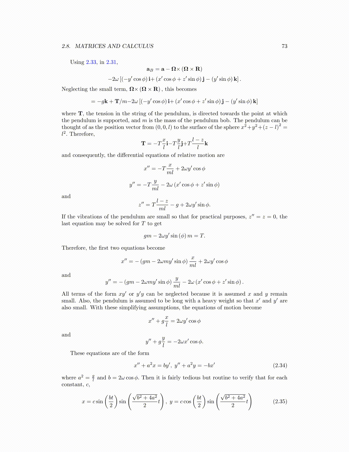 All terms of the form xy′ or y′y can be neglected because it is assumed x and y remainsmall. Also, the pendulum is assumed to be long with a heavy weight so that x′ and y′ arealso small. With these simplifying assumptions, the equations of motion become