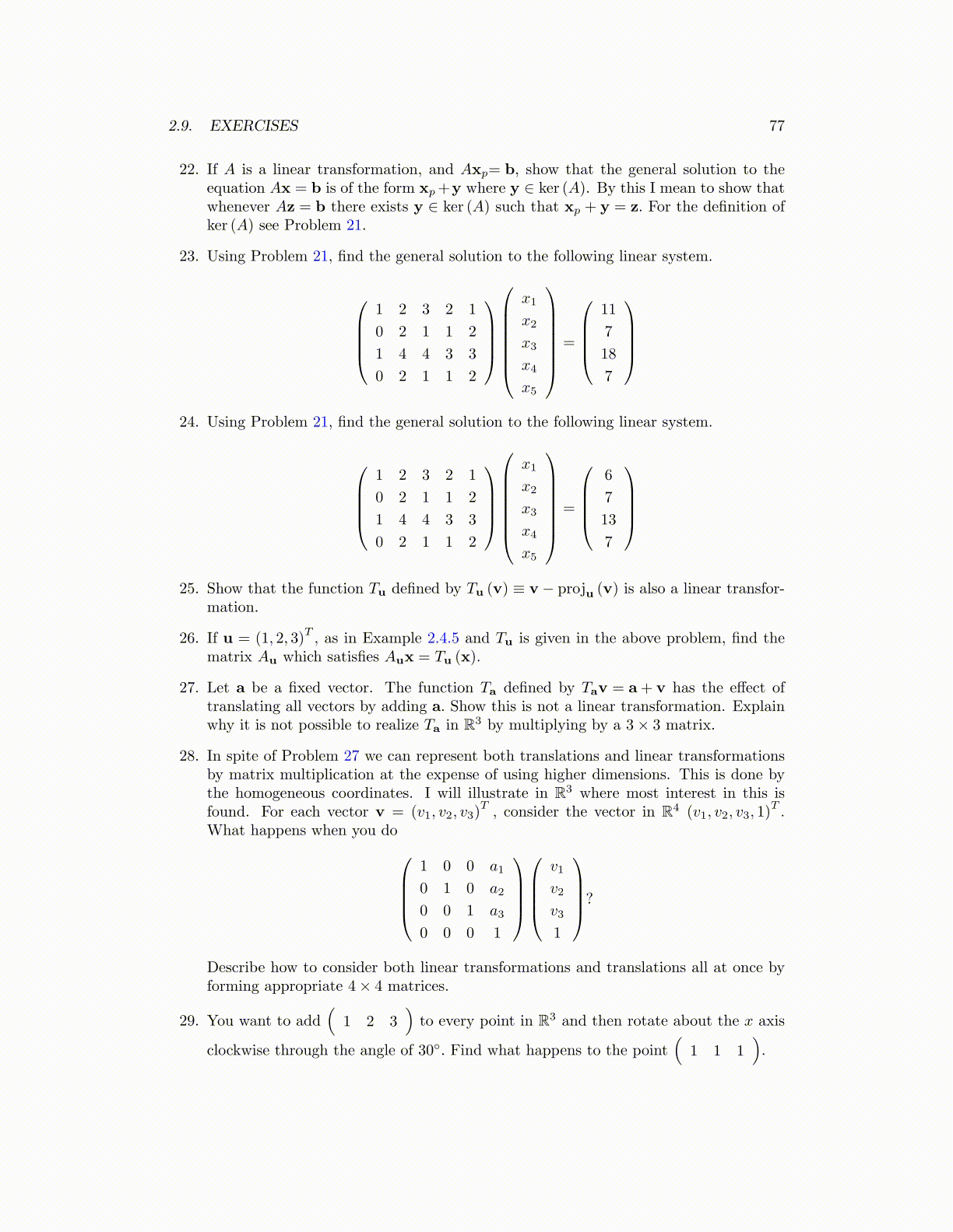 28. In spite of Problem 27 we can represent both translations and linear transformationsby matrix multiplication at the expense of using higher dimensions. This is done bythe homogeneous coordinates. I will illustrate in R3 where most interest in this isfound. For each vector v = (v1, v2, v3)