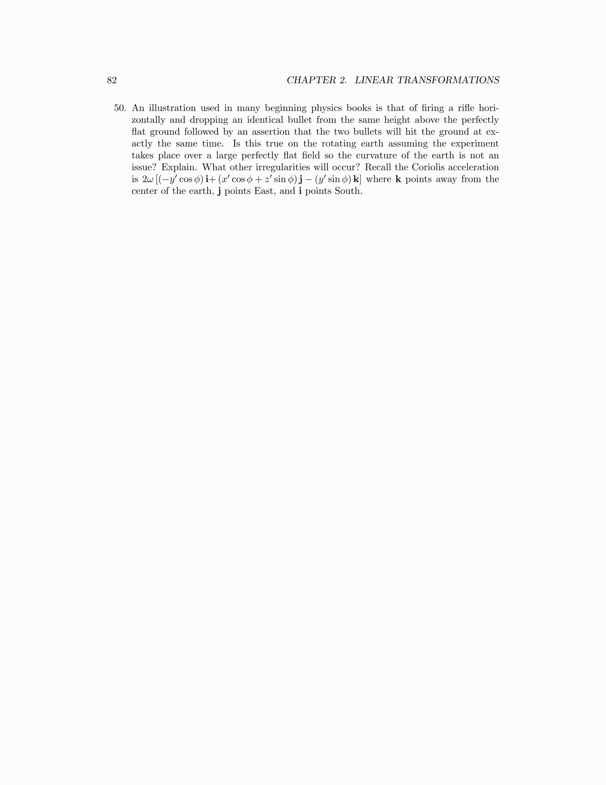 50. An illustration used in many beginning physics books is that of firing a rifle hori-zontally and dropping an identical bullet from the same height above the perfectlyflat ground followed by an assertion that the two bullets will hit the ground at ex-actly the same time. Is this true on the rotating earth assuming the experimenttakes place over a large perfectly flat field so the curvature of the earth is not anissue? Explain. What other irregularities will occur? Recall the Coriolis accelerationis 2ω [(−y′ cosϕ) i+(x′ cosϕ+ z′ sinϕ) j− (y′ sinϕ)k] where k points away from thecenter of the earth, j points East, and i points South.