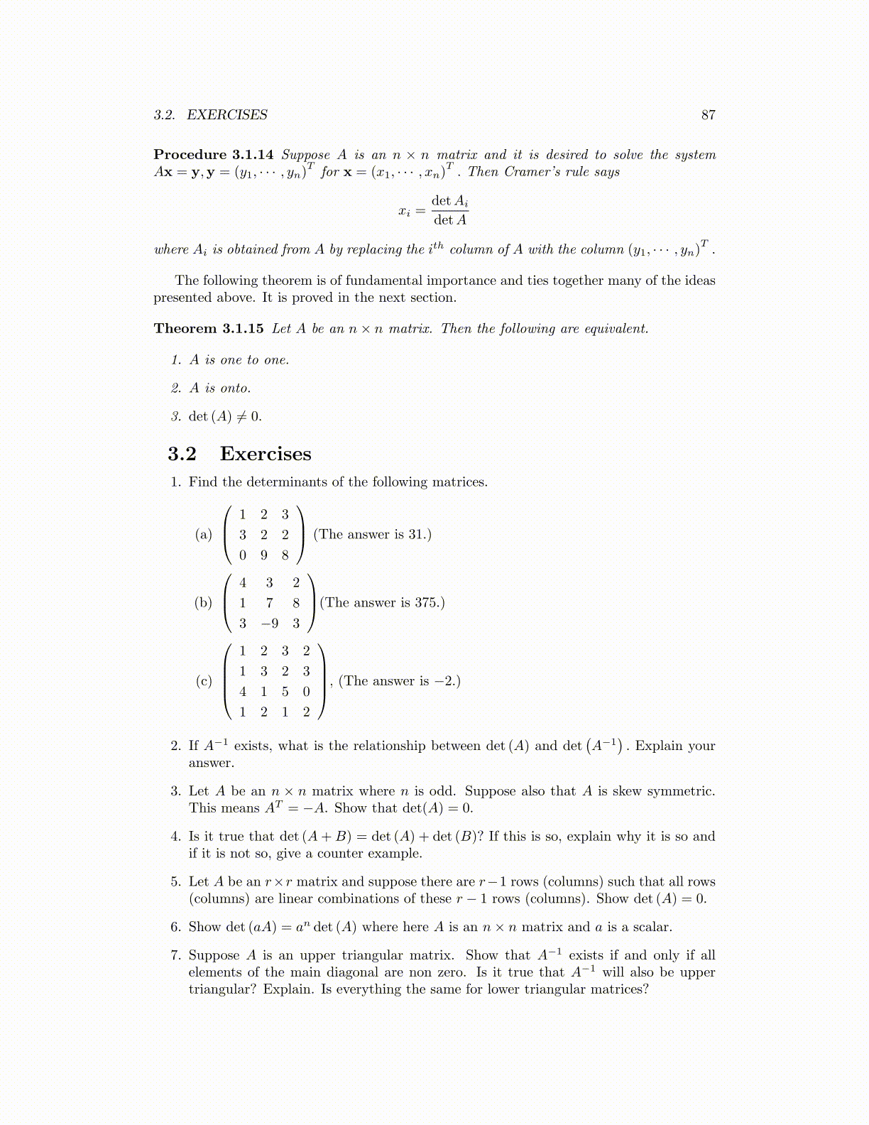 Procedure 3.1.14 Suppose A is an n × n matrix and it is desired to solve the systemAx = y,y = (y1, · · · , yn)T for x = (x1, · · · , xn)T . Then Cramer’s rule says