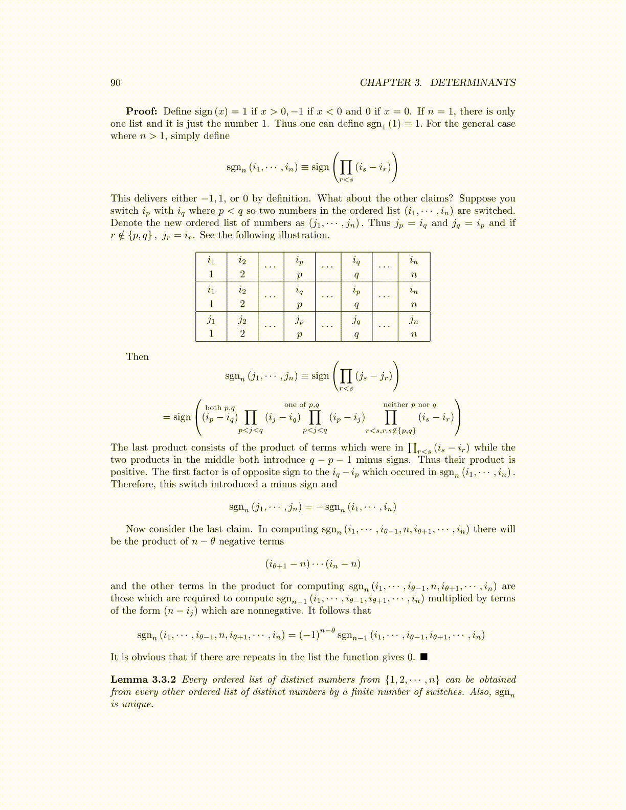 Lemma 3.3.2 Every ordered list of distinct numbers from {1, 2, · · · , n} can be obtainedfrom every other ordered list of distinct numbers by a finite number of switches. Also, sgnnis unique.