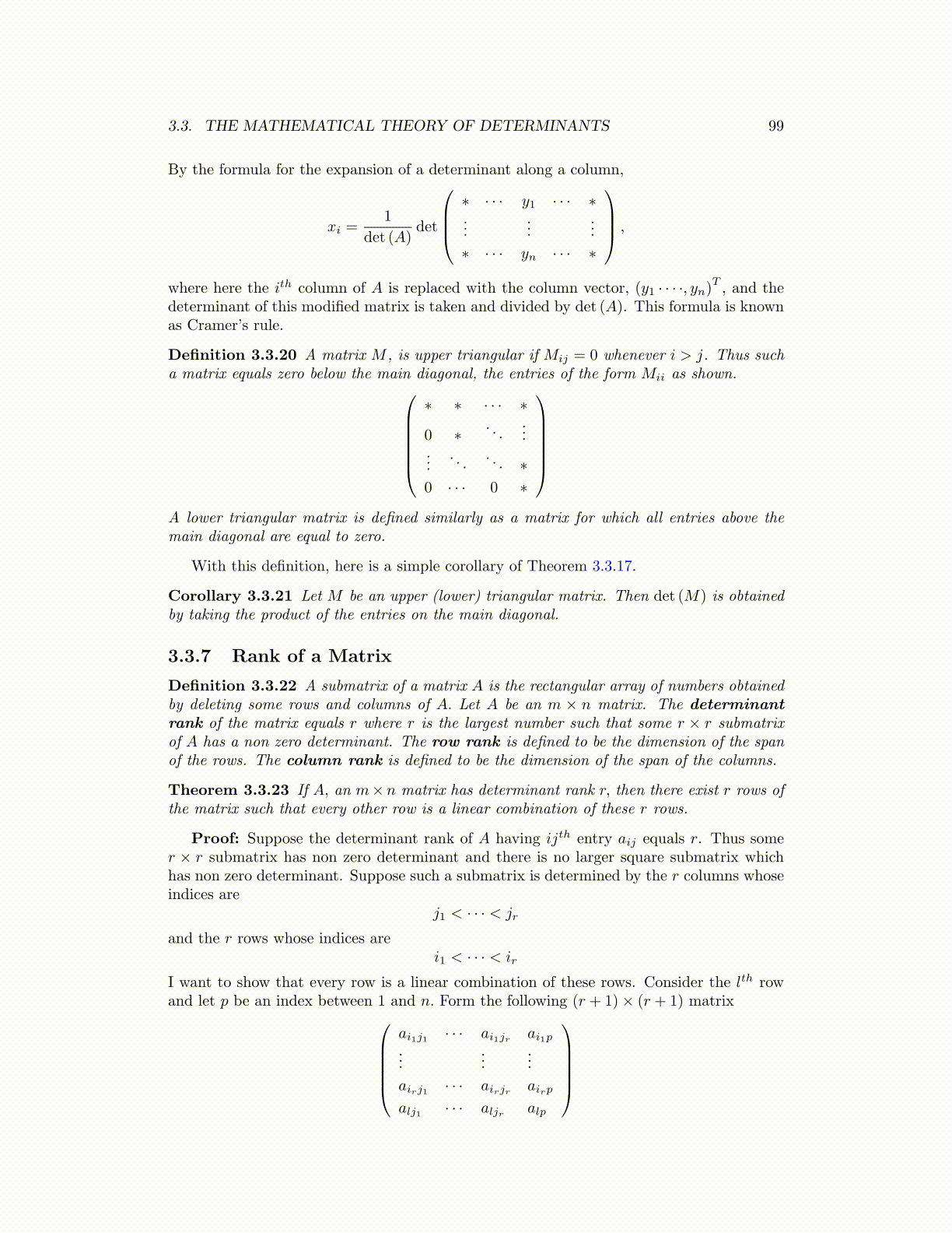 Theorem 3.3.23 If A, an m×n matrix has determinant rank r, then there exist r rows ofthe matrix such that every other row is a linear combination of these r rows.