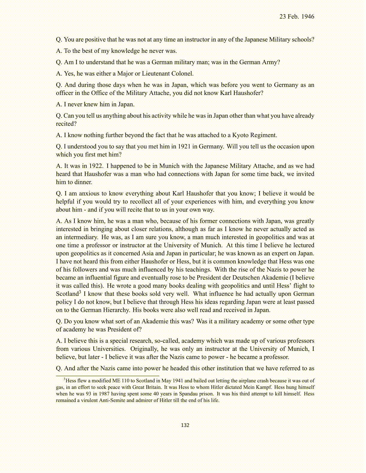 23 Feb. 1946 Q. You are positive that he was not at any time an instructor in any of the Japanese Military schools? A. To the best of my knowledge he never was. Q. Am I to understand that he was a German military man; was in the German Army? A. Yes, he was either a Major or Lieutenant Colonel. Q. And during those days when he was in Japan, which was before you went to Germany as an officer in the Office of the Military Attache, you did not know Karl Haushofer? A. I never knew him in Japan. Q. Can you tell us anything about his activity while he was in Japan other than what you have already recited? A. I know nothing further beyond the fact that he was attached to a Kyoto Regiment. Q. I understood you to say that you met him in 1921 in Germany. Will you tell us the occasion upon which you first met him? A. It was in 1922. I happened to be in Munich with the Japanese Military Attache, and as we had heard that Haushofer was a man who had connections with Japan for some time back, we invited him to dinner. Q. I am anxious to know everything about Karl Haushofer that you know; I believe it would be helpful if you would try to recollect all of your experiences with him, and everything you know about him - and if you will recite that to us in your own way. A. As I know him, he was a man who, because of his former connections with Japan, was greatly interested in bringing about closer relations, although as far as I know he never actually acted as an intermediary. He was, as I am sure you know, a man much interested in geopolitics and was at one time a professor or instructor at the University of Munich. At this time I believe he lectured upon geopolitics as it concerned Asia and Japan in particular; he was known as an expert on Japan. I have not heard this from either Haushofer or Hess, but it is common knowledge that Hess was one of his followers and was much influenced by his teachings. With the rise of the Nazis to power he became an influential figure and eventually rose to be President der Deutschen Akademie (I believe it was called this). He wrote a good many books dealing with geopolitics and until Hess’ flight to Scotland 3 I know that these books sold very well. What influence he had actually upon German policy I do not know, but I believe that through Hess his ideas regarding Japan were at least passed on to the German Hierarchy. His books were also well read and received in Japan. Q. Do you know what sort of an Akademie this was? Was it a military academy or some other type of academy he was President of? A. I believe this is a special research, so-called, academy which was made up of various professors from various Universities. Originally, he was only an instructor at the University of Munich, I believe, but later - I believe it was after the Nazis came to power - he became a professor. Q. And after the Nazis came into power he headed this other institution that we have referred to as 3 Hess flew a modified ME 110 to Scotland in May 1941 and bailed out letting the airplane crash because it was out of gas, in an effort to seek peace with Great Britain. It was Hess to whom Hitler dictated Mein Kampf. Hess hung himself when he was 93 in 1987 having spent some 40 years in Spandau prison. It was his third attempt to kill himself. Hess remained a virulent Anti-Semite and admirer of Hitler till the end of his life. 132
