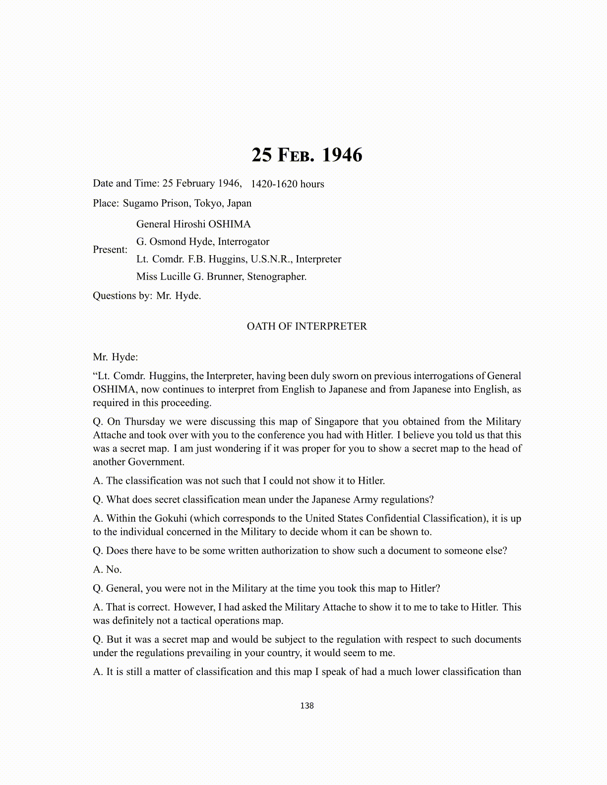 25 FEB. 1946 Date and Time: 25 February 1946, 1420-1620 hours Place: Sugamo Prison, Tokyo, Japan Present: General Hiroshi OSHIMA G. Osmond Hyde, Interrogator Lt. Comdr. F.B. Huggins, U.S.N.R., Interpreter Miss Lucille G. Brunner, Stenographer. Questions by: Mr. Hyde. OATH OF INTERPRETER Mr. Hyde: “Lt. Comdr. Huggins, the Interpreter, having been duly sworn on previous interrogations of General OSHIMA, now continues to interpret from English to Japanese and from Japanese into English, as required in this proceeding. Q. On Thursday we were discussing this map of Singapore that you obtained from the Military Attache and took over with you to the conference you had with Hitler. I believe you told us that this was a secret map. I am just wondering if it was proper for you to show a secret map to the head of another Government. A. The classification was not such that I could not show it to Hitler. Q. What does secret classification mean under the Japanese Army regulations? A. Within the Gokuhi (which corresponds to the United States Confidential Classification), it is up to the individual concerned in the Military to decide whom it can be shown to. Q. Does there have to be some written authorization to show such a document to someone else? A. No. Q. General, you were not in the Military at the time you took this map to Hitler? A. That is correct. However, I had asked the Military Attache to show it to me to take to Hitler. This was definitely not a tactical operations map. Q. But it was a secret map and would be subject to the regulation with respect to such documents under the regulations prevailing in your country, it would seem to me. A. It is still a matter of classification and this map I speak of had a much lower classification than 138