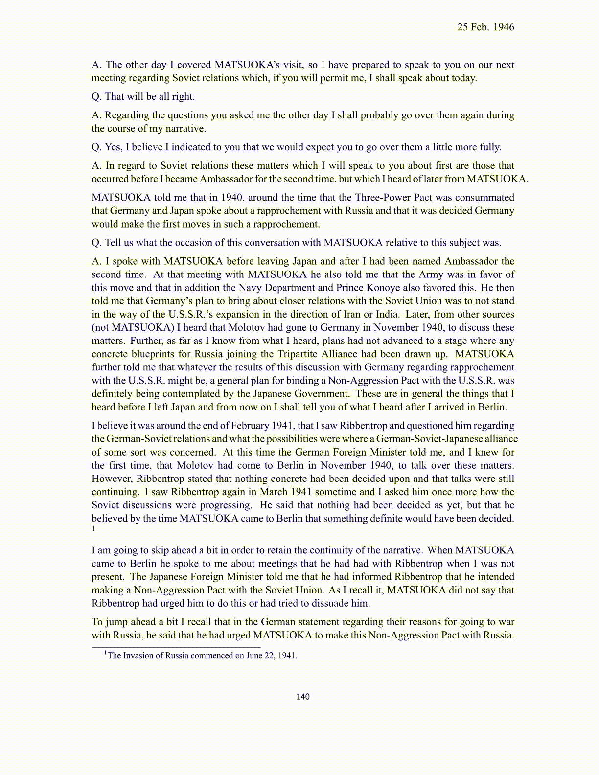 25 Feb. 1946 A. The other day I covered MATSUOKA’s visit, so I have prepared to speak to you on our next meeting regarding Soviet relations which, if you will permit me, I shall speak about today. Q. That will be all right. A. Regarding the questions you asked me the other day I shall probably go over them again during the course of my narrative. Q. Yes, I believe I indicated to you that we would expect you to go over them a little more fully. A. In regard to Soviet relations these matters which I will speak to you about first are those that occurred before I became Ambassador for the second time, but which I heard of later from MATSUOKA. MATSUOKA told me that in 1940, around the time that the Three-Power Pact was consummated that Germany and Japan spoke about a rapprochement with Russia and that it was decided Germany would make the first moves in such a rapprochement. Q. Tell us what the occasion of this conversation with MATSUOKA relative to this subject was. A. I spoke with MATSUOKA before leaving Japan and after I had been named Ambassador the second time. At that meeting with MATSUOKA he also told me that the Army was in favor of this move and that in addition the Navy Department and Prince Konoye also favored this. He then told me that Germany’s plan to bring about closer relations with the Soviet Union was to not stand in the way of the U.S.S.R.’s expansion in the direction of Iran or India. Later, from other sources (not MATSUOKA) I heard that Molotov had gone to Germany in November 1940, to discuss these matters. Further, as far as I know from what I heard, plans had not advanced to a stage where any concrete blueprints for Russia joining the Tripartite Alliance had been drawn up. MATSUOKA further told me that whatever the results of this discussion with Germany regarding rapprochement with the U.S.S.R. might be, a general plan for binding a Non-Aggression Pact with the U.S.S.R. was definitely being contemplated by the Japanese Government. These are in general the things that I heard before I left Japan and from now on I shall tell you of what I heard after I arrived in Berlin. I believe it was around the end of February 1941, that I saw Ribbentrop and questioned him regarding the German-Soviet relations and what the possibilities were where a German-Soviet-Japanese alliance of some sort was concerned. At this time the German Foreign Minister told me, and I knew for the first time, that Molotov had come to Berlin in November 1940, to talk over these matters. However, Ribbentrop stated that nothing concrete had been decided upon and that talks were still continuing. I saw Ribbentrop again in March 1941 sometime and I asked him once more how the Soviet discussions were progressing. He said that nothing had been decided as yet, but that he believed by the time MATSUOKA came to Berlin that something definite would have been decided. 1 I am going to skip ahead a bit in order to retain the continuity of the narrative. When MATSUOKA came to Berlin he spoke to me about meetings that he had had with Ribbentrop when I was not present. The Japanese Foreign Minister told me that he had informed Ribbentrop that he intended making a Non-Aggression Pact with the Soviet Union. As I recall it, MATSUOKA did not say that Ribbentrop had urged him to do this or had tried to dissuade him. To jump ahead a bit I recall that in the German statement regarding their reasons for going to war with Russia, he said that he had urged MATSUOKA to make this Non-Aggression Pact with Russia. 1 The Invasion of Russia commenced on June 22, 1941. 140